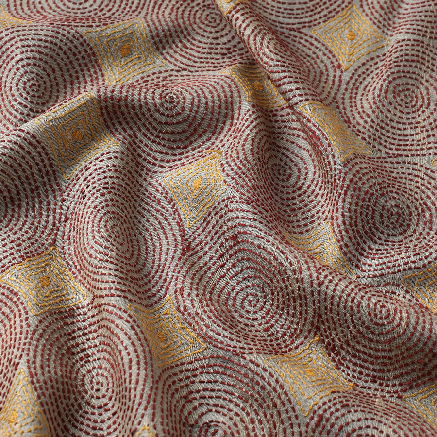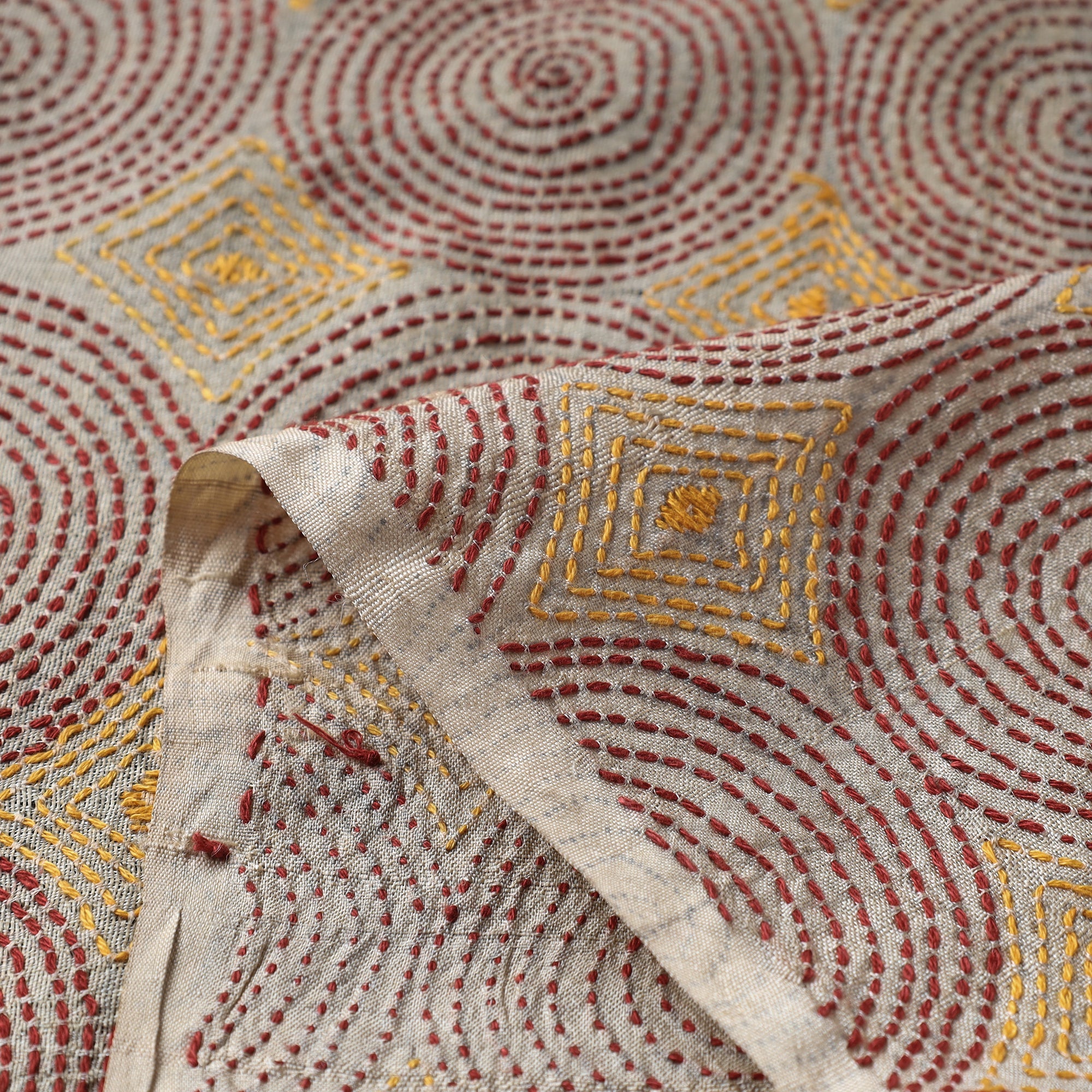 Beige - Handloom Pure Tussar Silk Kantha Work Fabric 13
