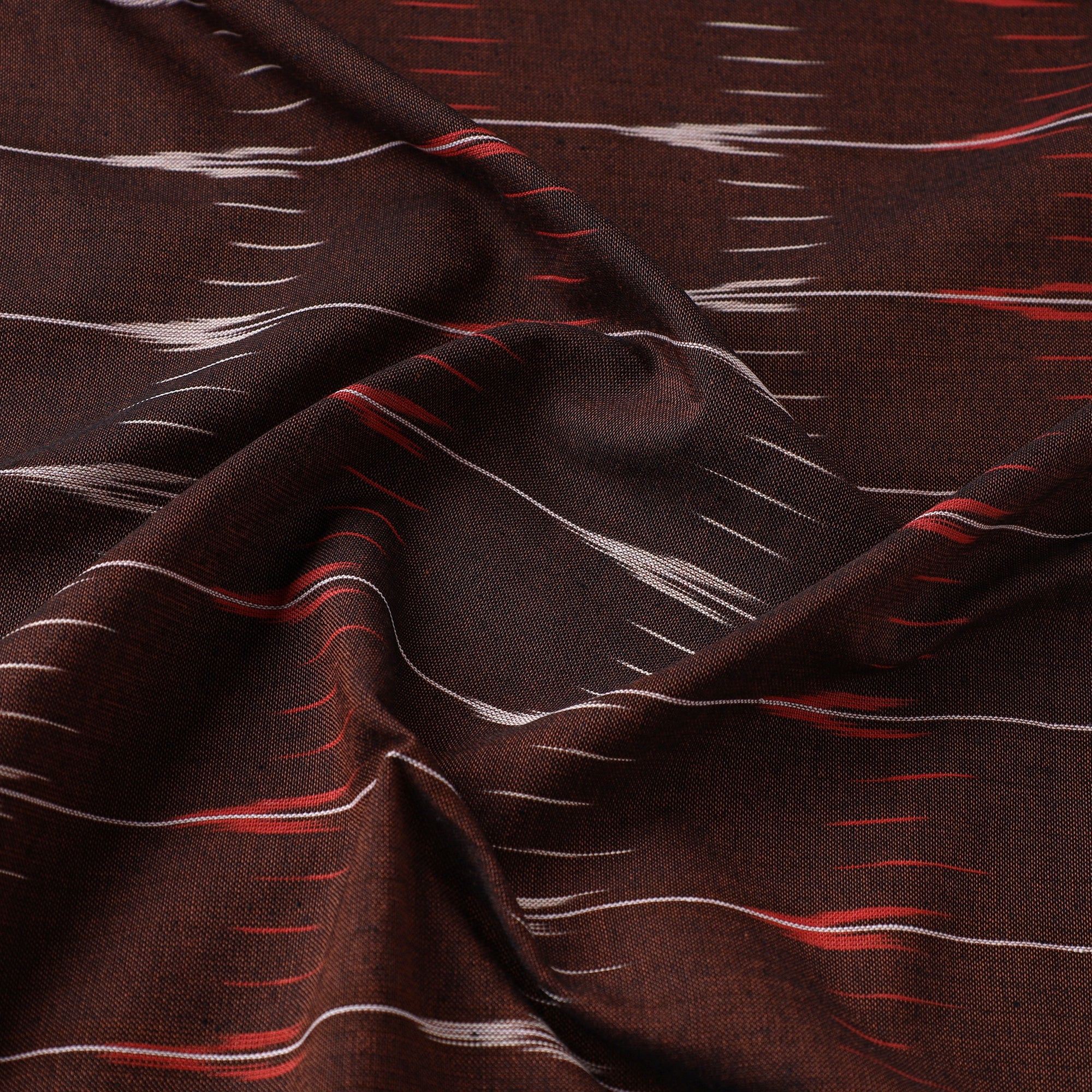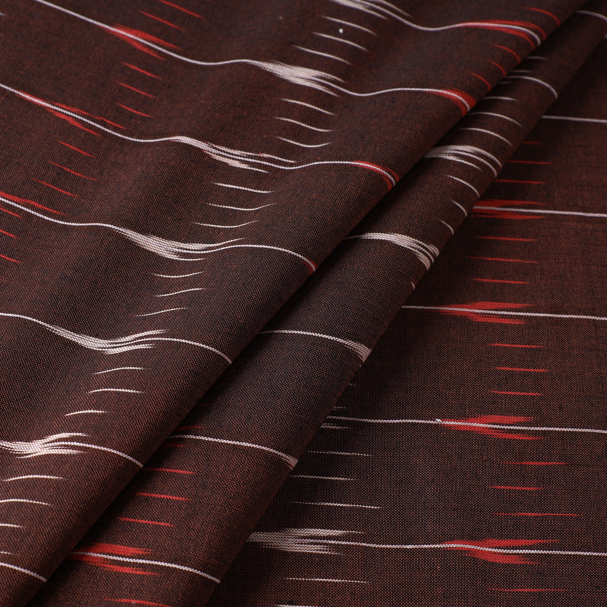 Fine quality brown with lines & butta pochampally ikat weave cotton fabric from Telangana. Ikat (Ikkat) is a dyeing technique used to pattern textiles that employs a resist dyeing process similar to tie-dye on either the warp or weft fibers prior to dyeing. Ikat has lovely patterns and are world famous for their extremely beautiful colors, texture and designs. Indian Ikat is always admired by the fashion designers around the world.