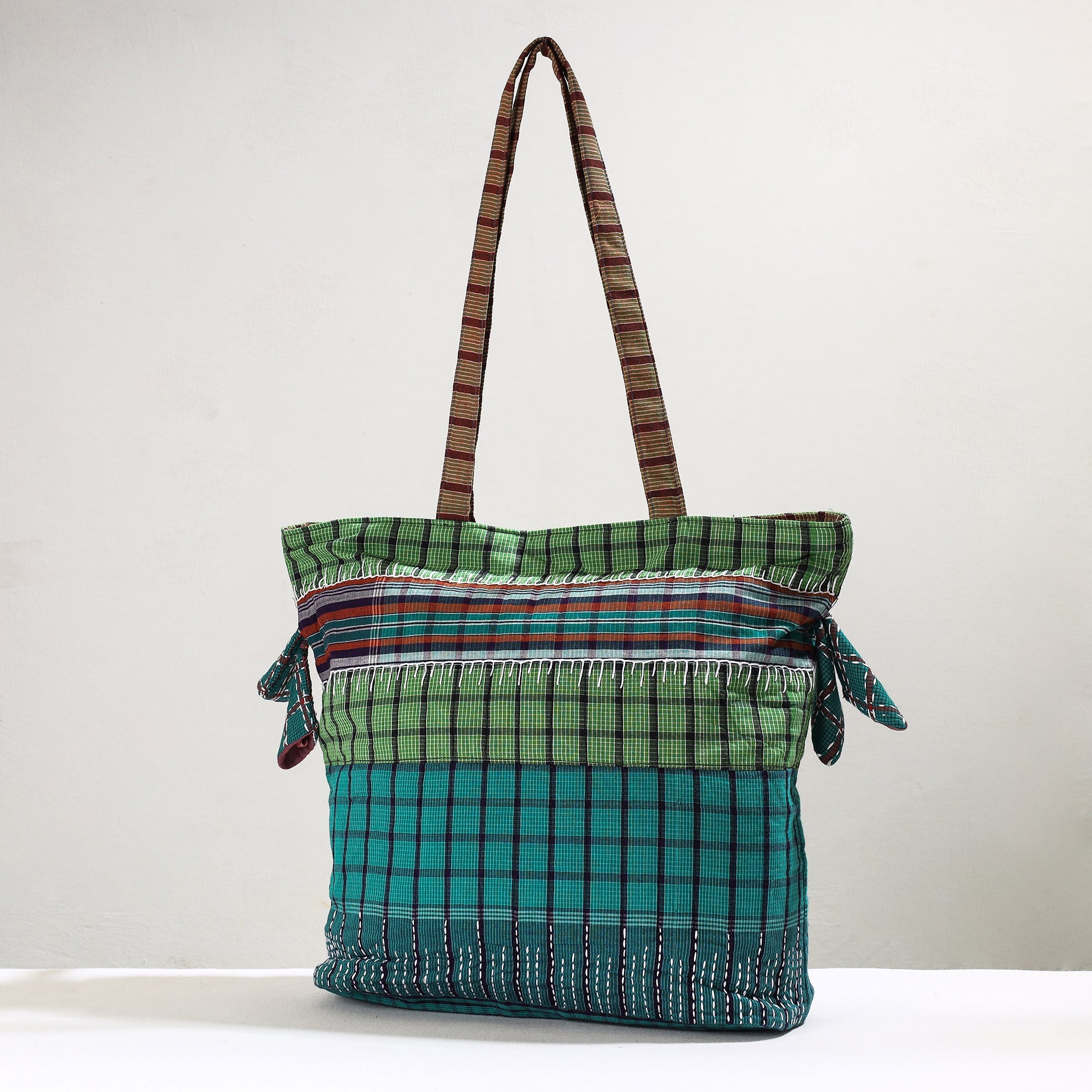 Elevate your style with our green handmade gamcha fabric kantha work tote bag. Meticulously crafted, the tote bag combines the traditional charm of Gamcha fabric with exquisite Kantha stitching. It has one zipper pocket. And it has enough space to accommodate most of the items. Embrace the charm of handmade craftsmanship while enjoying the functionality of a trendy, totebag.