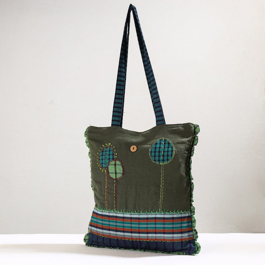 Elevate your style with our green handmade gamcha fabric embroidered applique work cotton hand bag. Crafted with care, this unique accessory blends traditional artistry and modern fashion. It has one simple pocket. And it has enough space to accommodate most of the items. Embrace the charm of handmade craftsmanship while enjoying the functionality of a trendy, handbag.