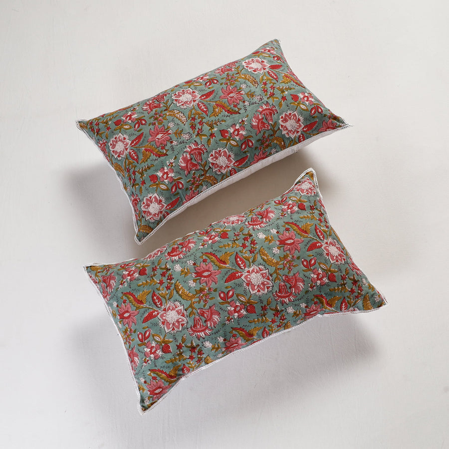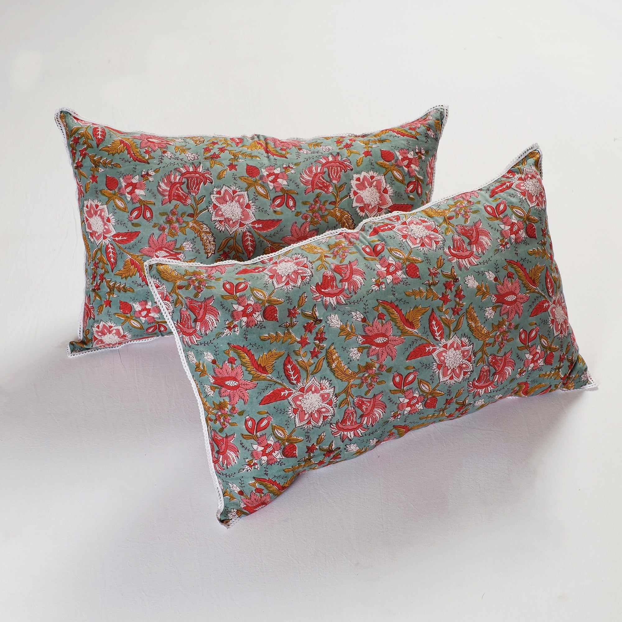 Fine quality sanganeri hand block printed pure cotton pillow cover with lace. Sanganeri is a hand-block printing technique originating from Sanganer, a village in the southern part of Jaipur, Rajasthan. Bleed free VAT dyes used.
