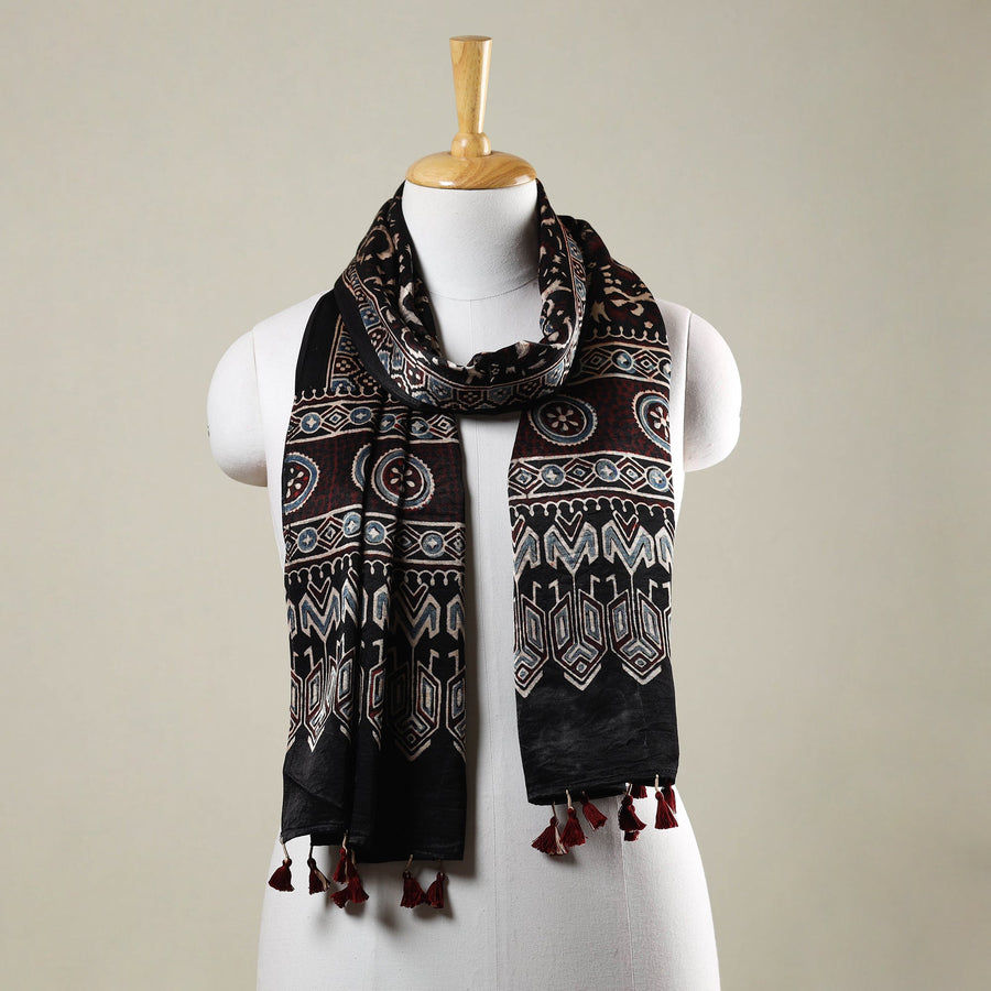 Exquisite beauty of this fine quality black ajrakh hand block printed mashru silk stole with tassels. This exquisite stole is crafted from a blend of mashru silk and cotton threads, with simple cotton on one side and the rich appearance of glistening silk on the other. It boasts a soft, shiny, and highly lustrous texture. This stole showcases the intricate art of ajrakh hand-block printing, a traditional technique practiced by skilled artisans in the Kutch region of Gujarat. This stole is made using natural dyes, adding an eco-friendly touch to its charm. Adorned with mesmerizing Ajrakh patterns and designs, it reflects the rich cultural heritage of the region.