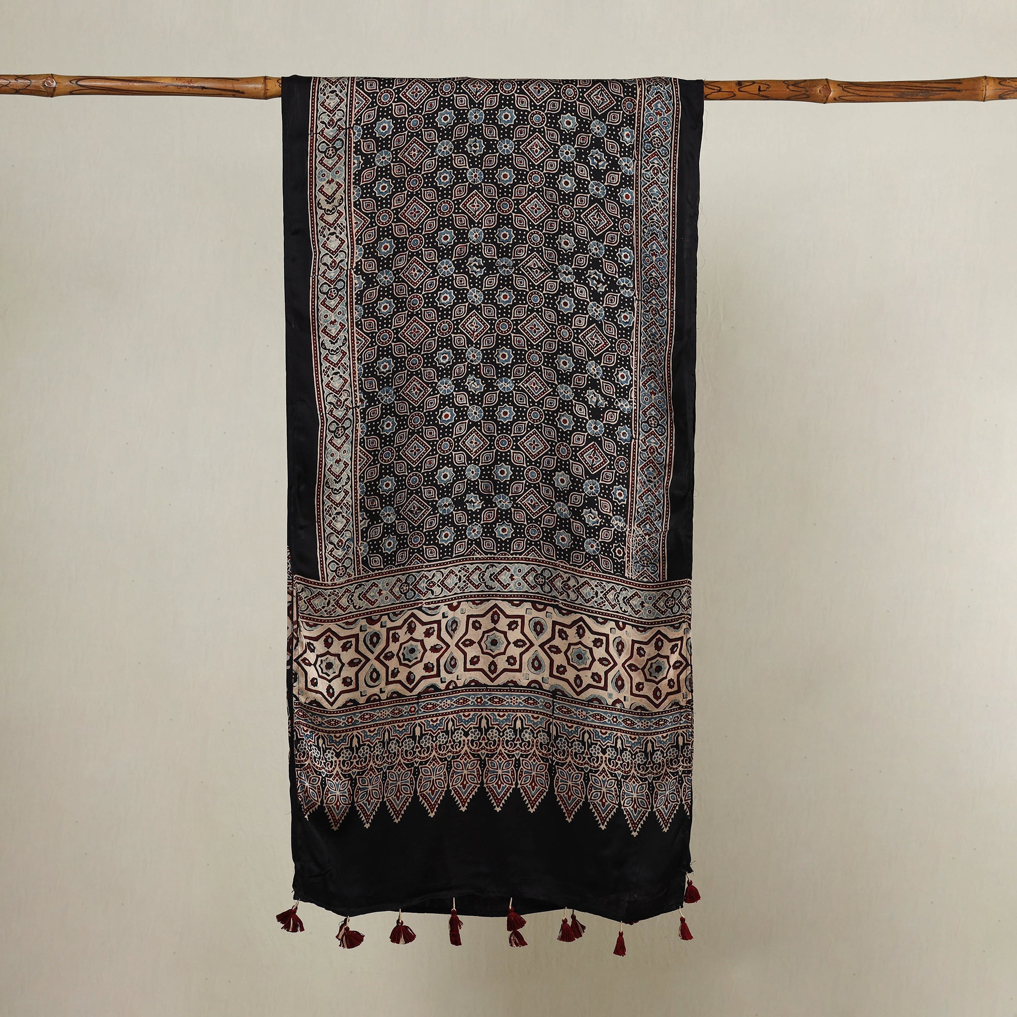 Exquisite beauty of this fine quality black ajrakh hand block printed modal silk stole with tassels. The stole is made from luxurious modal silk and is adorned with delicate tassels, adding a touch of elegance. Crafted with utmost care, this stole showcases the intricate art of ajrakh hand-block printing, a traditional technique practiced by skilled artisans in the Kutch region of Gujarat. This stole is made using natural dyes, adding an eco-friendly touch to its charm. Adorned with mesmerizing Ajrakh patterns and designs, it reflects the rich cultural heritage of the region.