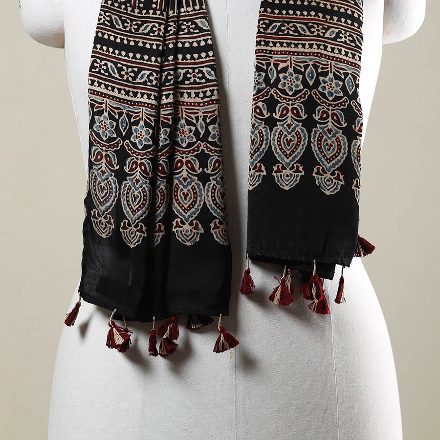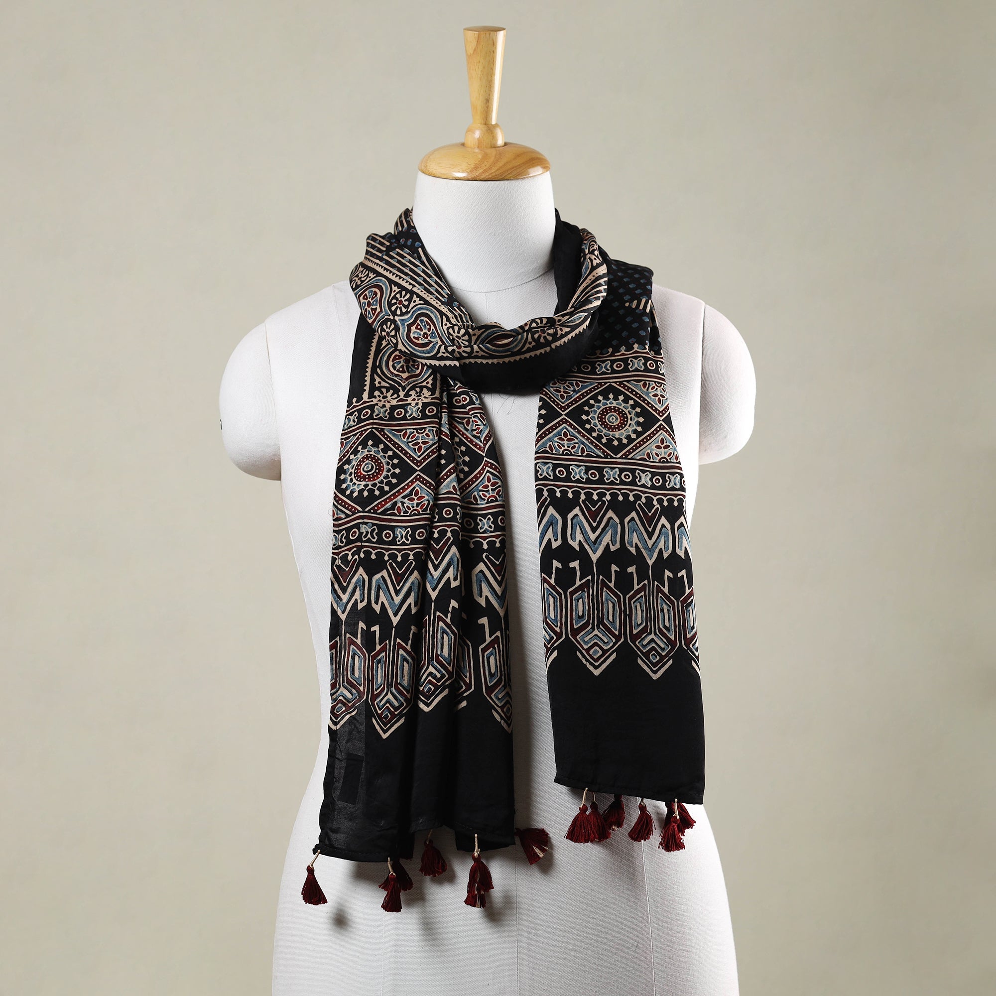 Exquisite beauty of this fine quality black ajrakh hand block printed modal silk stole with tassels. The stole is made from luxurious modal silk and is adorned with delicate tassels, adding a touch of elegance. Crafted with utmost care, this stole showcases the intricate art of ajrakh hand-block printing, a traditional technique practiced by skilled artisans in the Kutch region of Gujarat. This stole is made using natural dyes, adding an eco-friendly touch to its charm. Adorned with mesmerizing Ajrakh patterns and designs, it reflects the rich cultural heritage of the region.