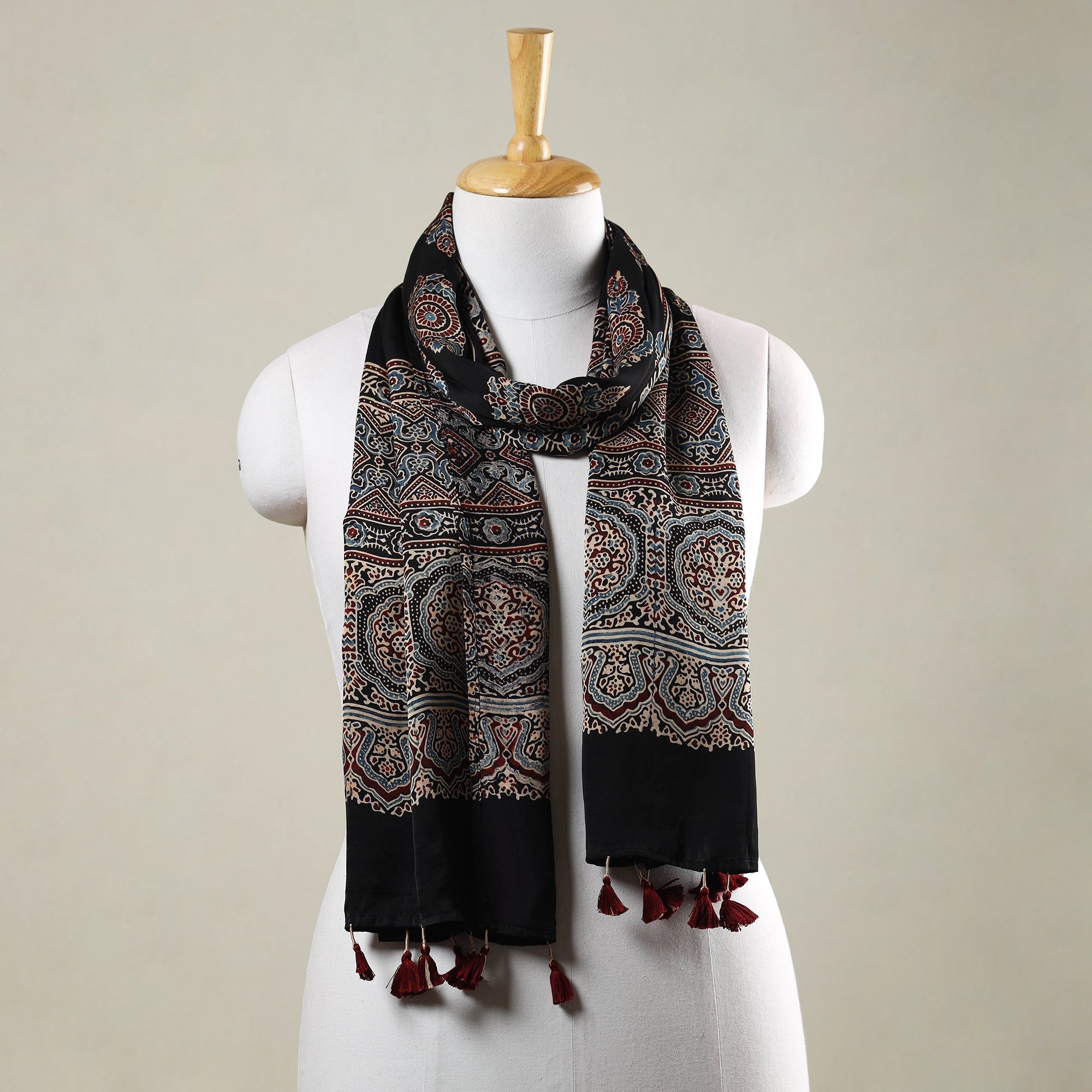 | Material | Exquisite beauty of this fine quality black ajrakh hand block printed modal silk stole with tassels. The stole is made from luxurious modal silk and is adorned with delicate tassels, adding a touch of elegance. Crafted with utmost care, this stole showcases the intricate art of ajrakh hand-block printing, a traditional technique practiced by skilled artisans in the Kutch region of Gujarat. This stole is made using natural dyes, adding an eco-friendly touch to its charm. Adorned with mesmerizing Ajrakh patterns and designs, it reflects the rich cultural heritage of the region. |