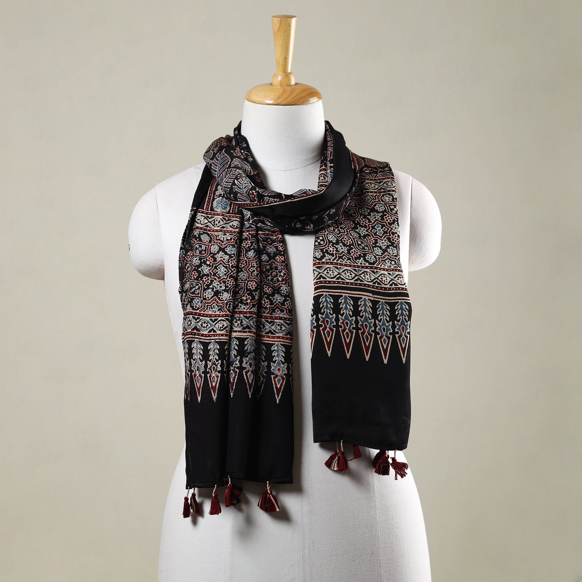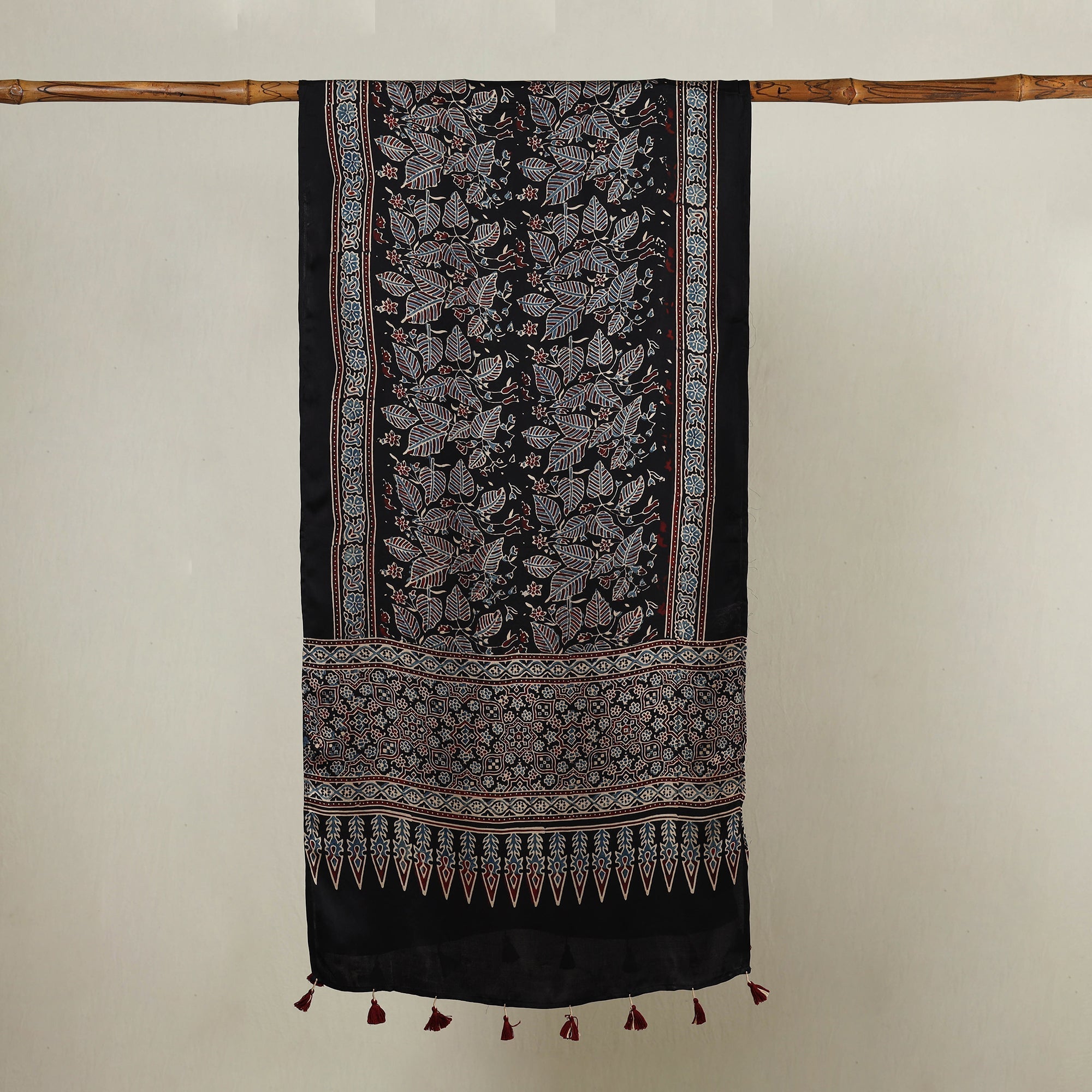 Material Exquisite beauty of this fine quality black ajrakh hand block printed modal silk stole with tassels. The stole is made from luxurious modal silk and is adorned with delicate tassels, adding a touch of elegance. Crafted with utmost care, this stole showcases the intricate art of ajrakh hand-block printing, a traditional technique practiced by skilled artisans in the Kutch region of Gujarat. This stole is made using natural dyes, adding an eco-friendly touch to its charm. Adorned with mesmerizing Ajrakh patterns and designs, it reflects the rich cultural heritage of the region.