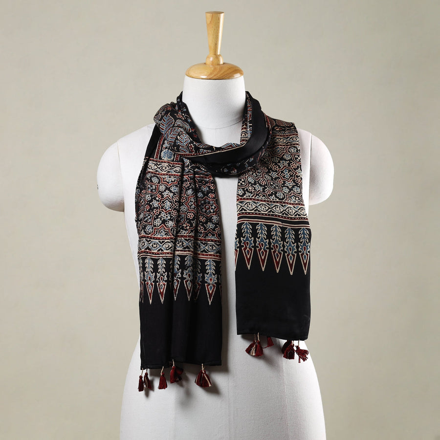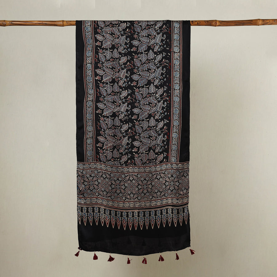 Black - Ajrakh Hand Block Printed Modal Silk Stole with Tassels