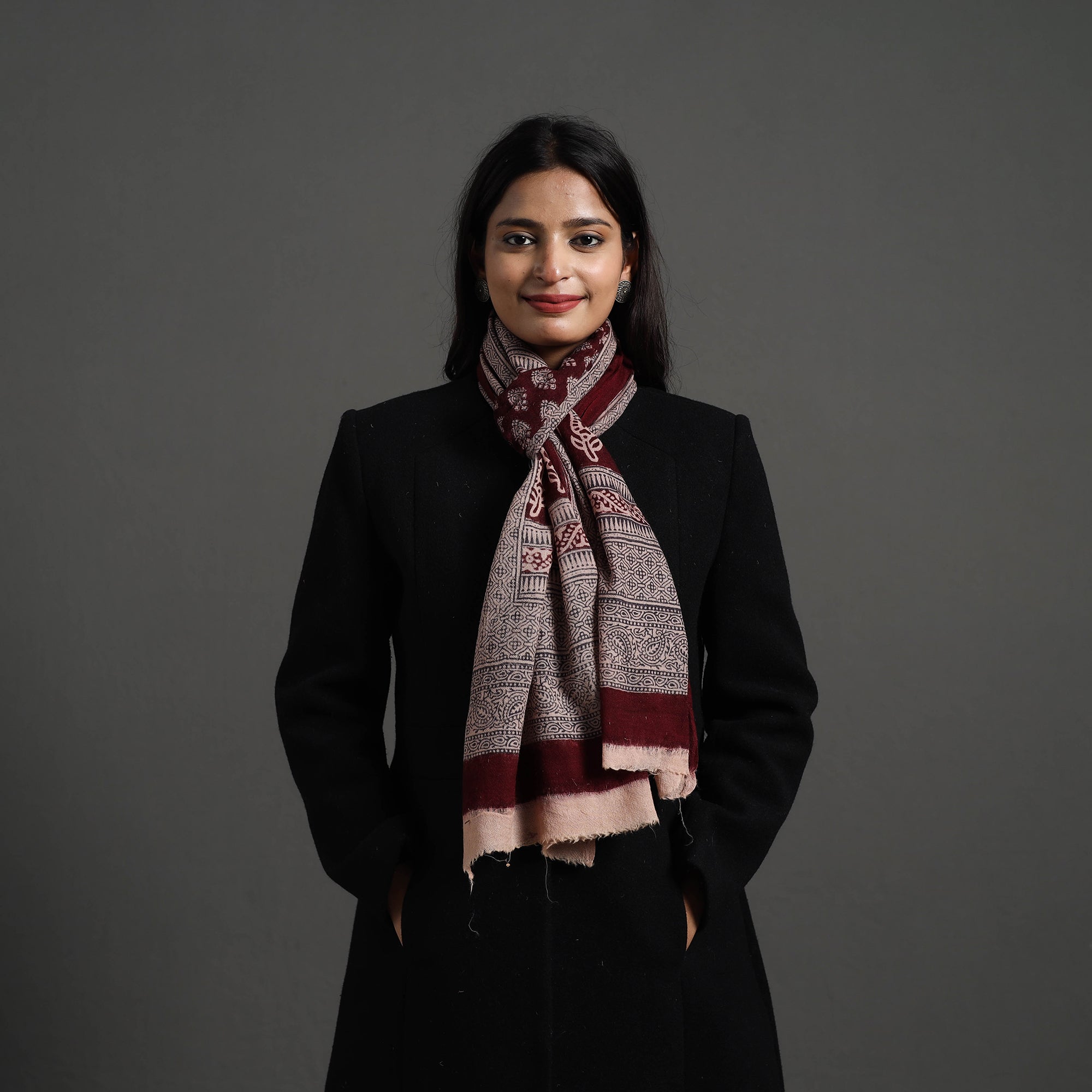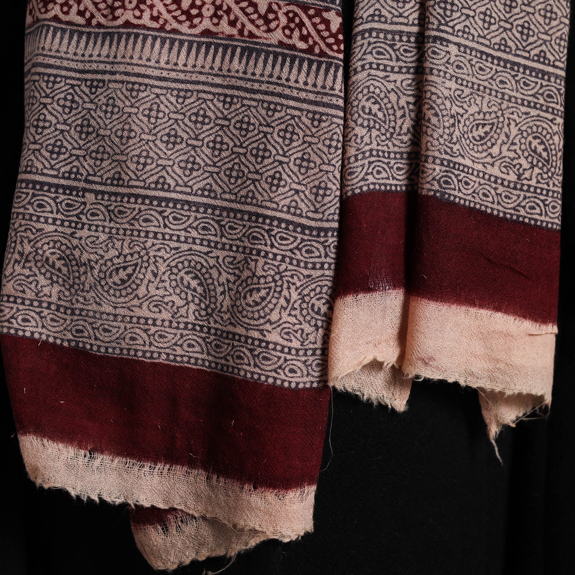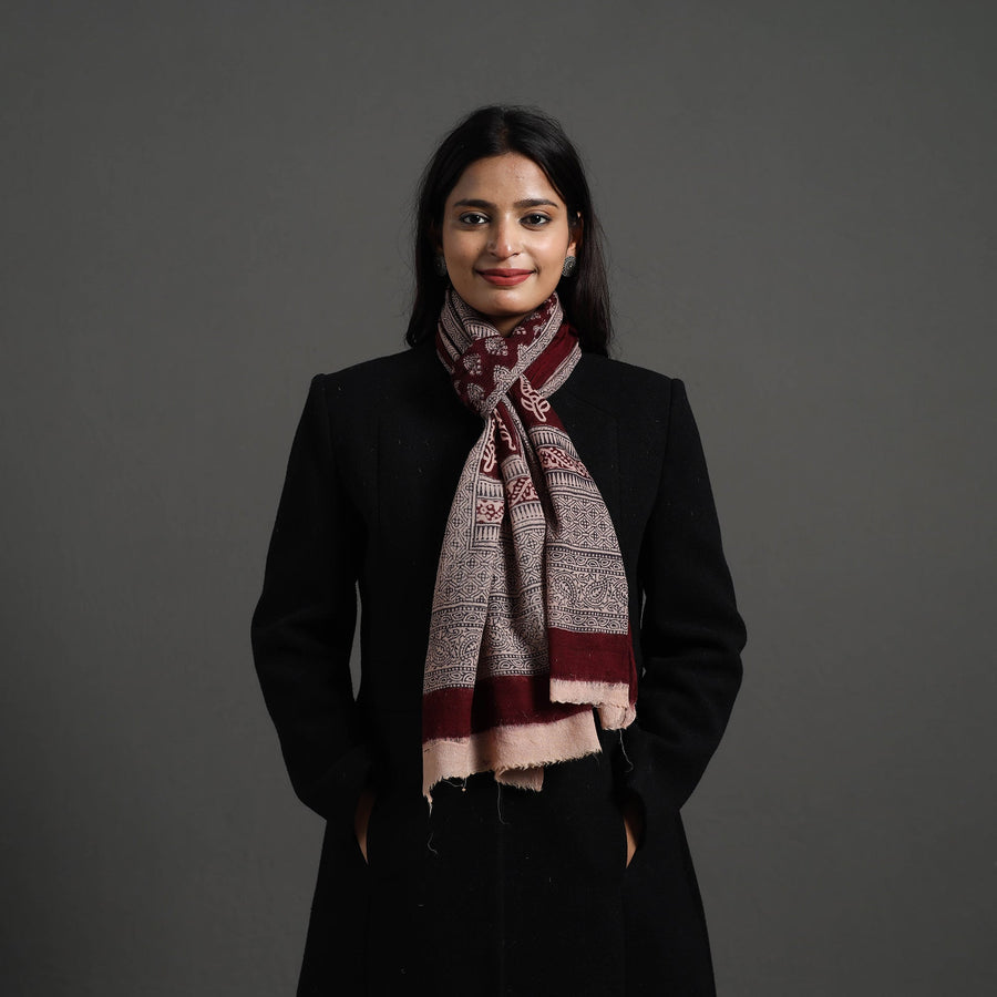 Elevate your style with this fine quality maroon bagh hand block printed pure wool stole. This exquisite stole is made using natural dyes through the traditional process of hand block printing by Umar faruk khatri in Bagh, the Dhar district of Madhya Pradesh. The pure wool construction offers exceptional warmth and softness, making it perfect for cold weather. This exquisite stole can elevate any outfit. It's versatile, suitable for both formal and casual occasions, adding a touch of traditional Indian artistry to your style.