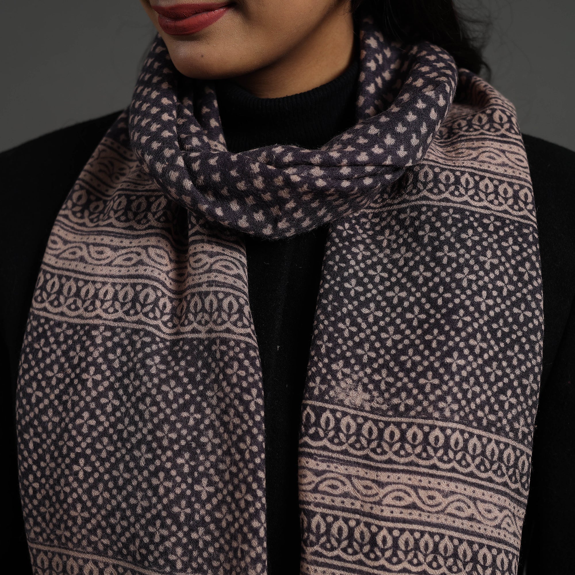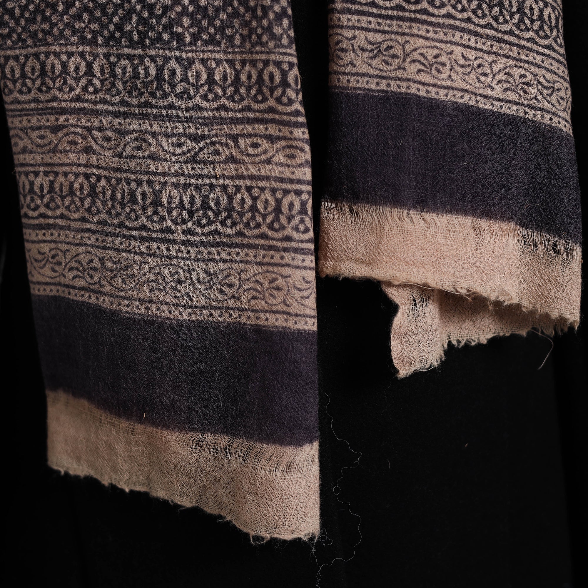 Elevate your style with this fine quality black bagh hand block printed pure woollen stole. This exquisite stole is made using natural dyes through the traditional process of hand block printing by Umar faruk khatri in Bagh, the Dhar district of Madhya Pradesh. The pure wool construction offers exceptional warmth and softness, making it perfect for cold weather. This exquisite stole can elevate any outfit. It's versatile, suitable for both formal and casual occasions, adding a touch of traditional Indian artistry to your style.