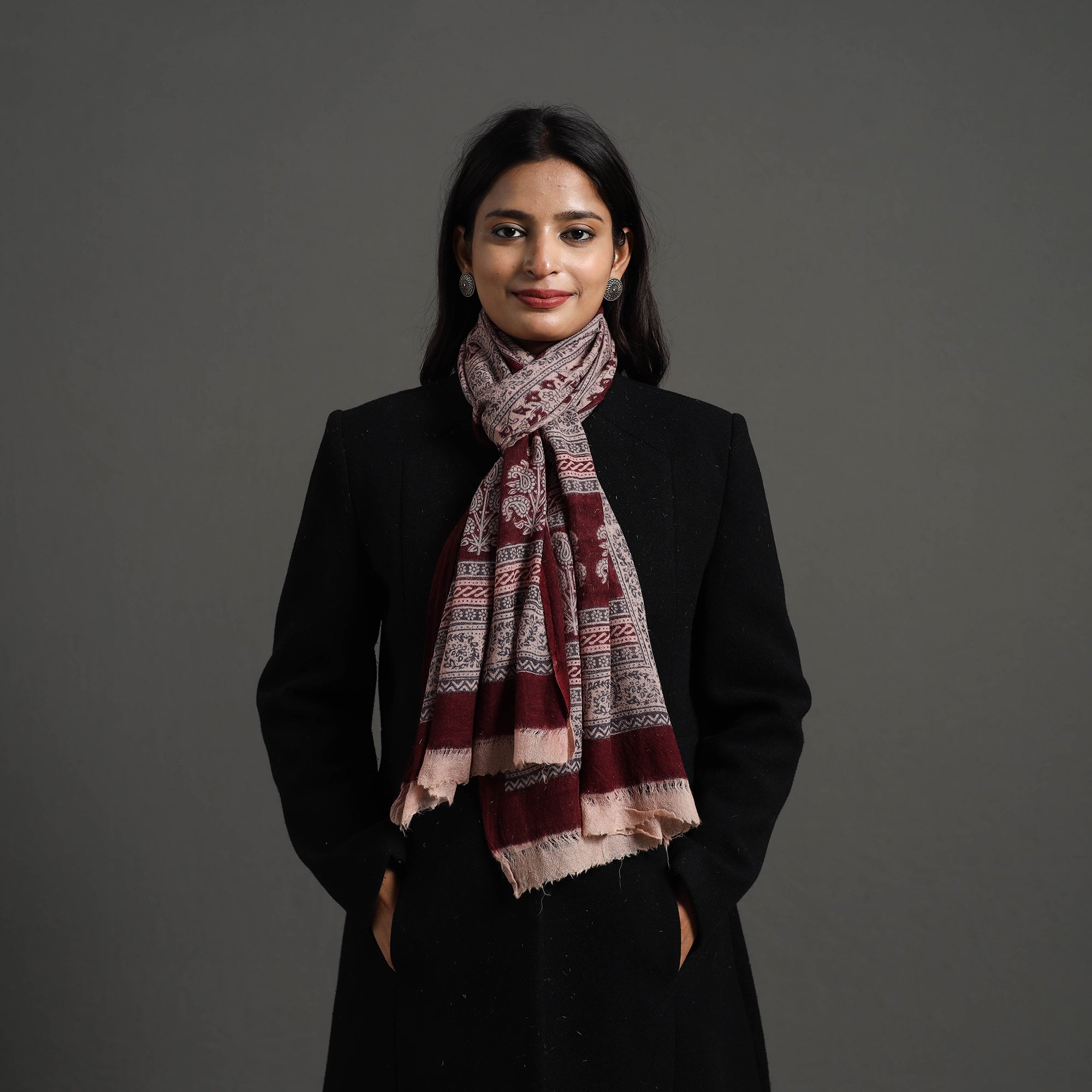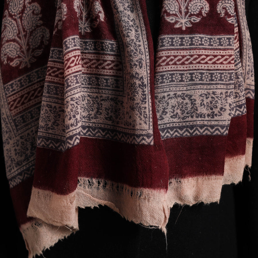 Elevate your style with this fine quality maroon bagh hand block printed pure wool stole. This exquisite stole is made using natural dyes through the traditional process of hand block printing by Umar faruk khatri in Bagh, the Dhar district of Madhya Pradesh. The pure wool construction offers exceptional warmth and softness, making it perfect for cold weather. This exquisite stole can elevate any outfit. It's versatile, suitable for both formal and casual occasions, adding a touch of traditional Indian artistry to your style.