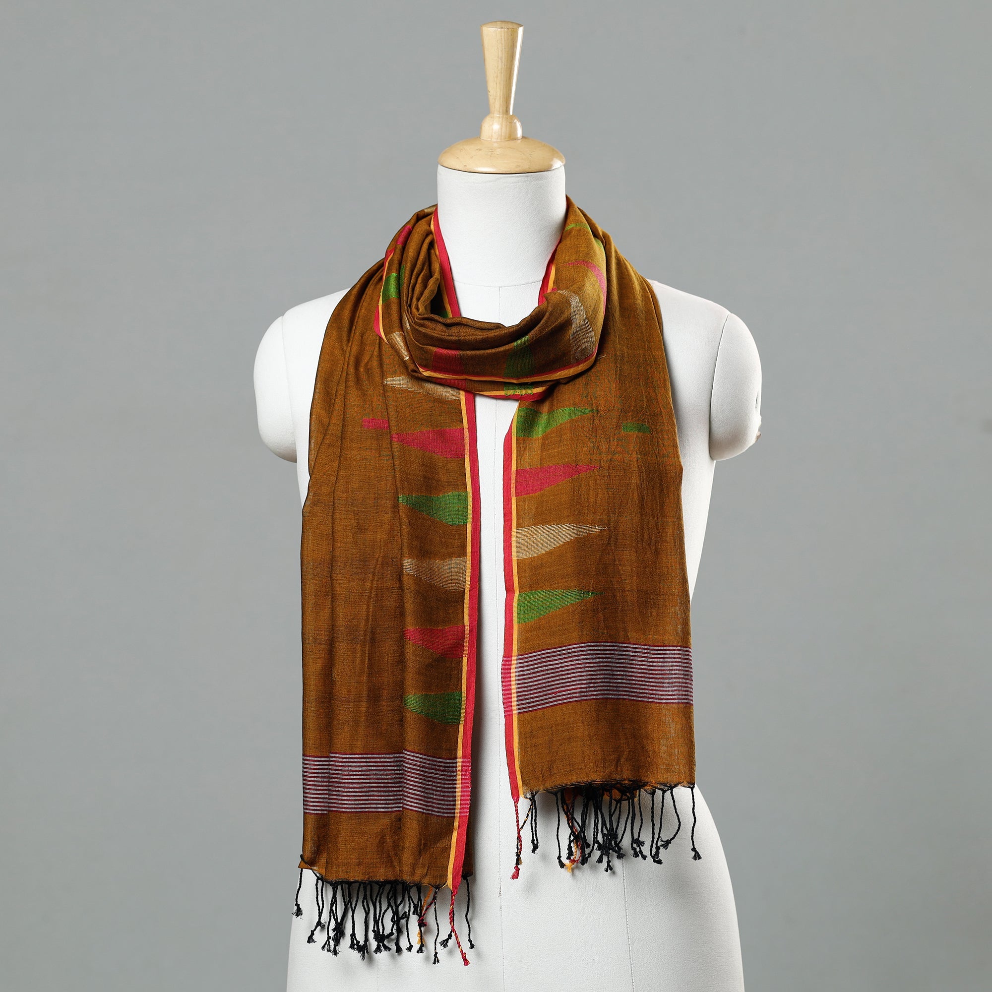 Experience the exquisite craftsmanship with our jamdani handloom cotton stole, made by the skilled artisans of Habibpur, Nadia District, West Bengal. Adorned with charming tassels. It seamlessly transitions from casual to formal occasions. This stole is a testament to the traditional weaving technique of Jamdani, showcasing the skilled artistry of West Bengal's artisans. Embrace elegance and cultural heritage in every thread.