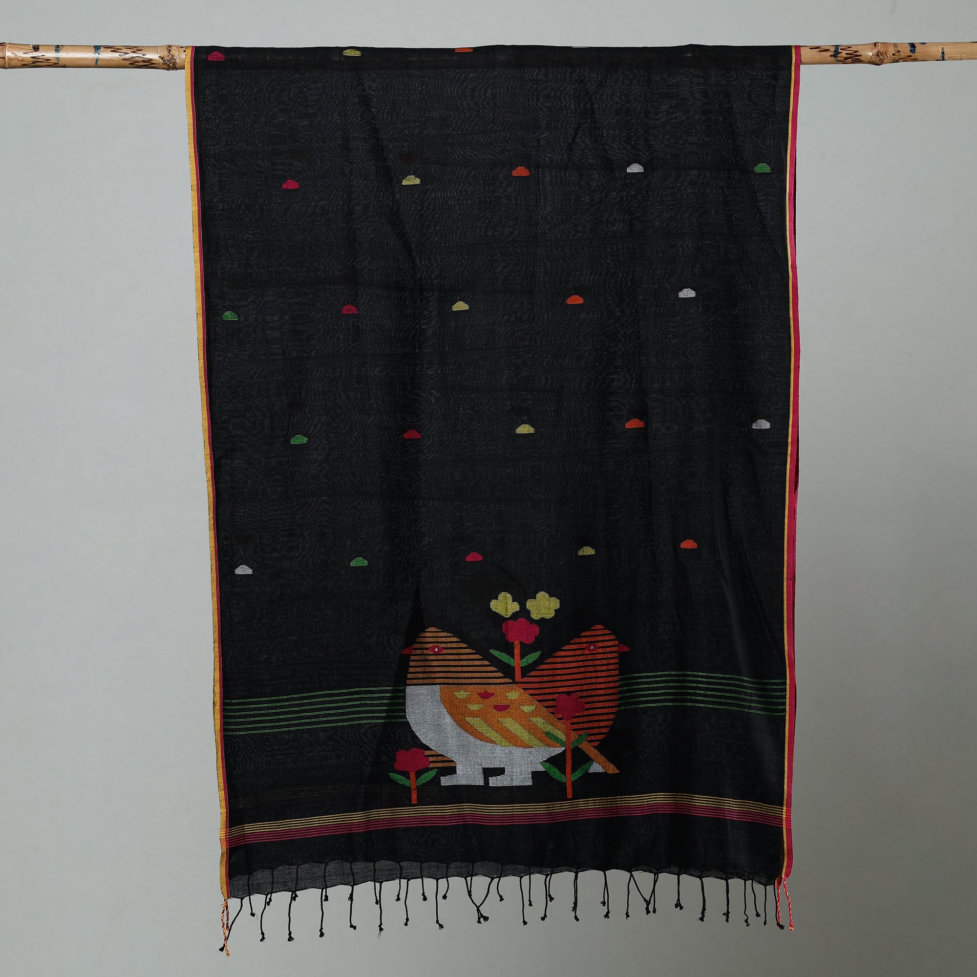 Experience the exquisite craftsmanship with our jamdani handloom cotton stole, made by the skilled artisans of Habibpur, Nadia District, West Bengal. Adorned with charming tassels. It seamlessly transitions from casual to formal occasions. This stole is a testament to the traditional weaving technique of Jamdani, showcasing the skilled artistry of West Bengal's artisans. Embrace elegance and cultural heritage in every thread.