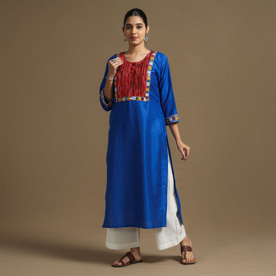 Blue - Plain Slub Silk Pintuck Straight Kurta with Ikat Patchwork