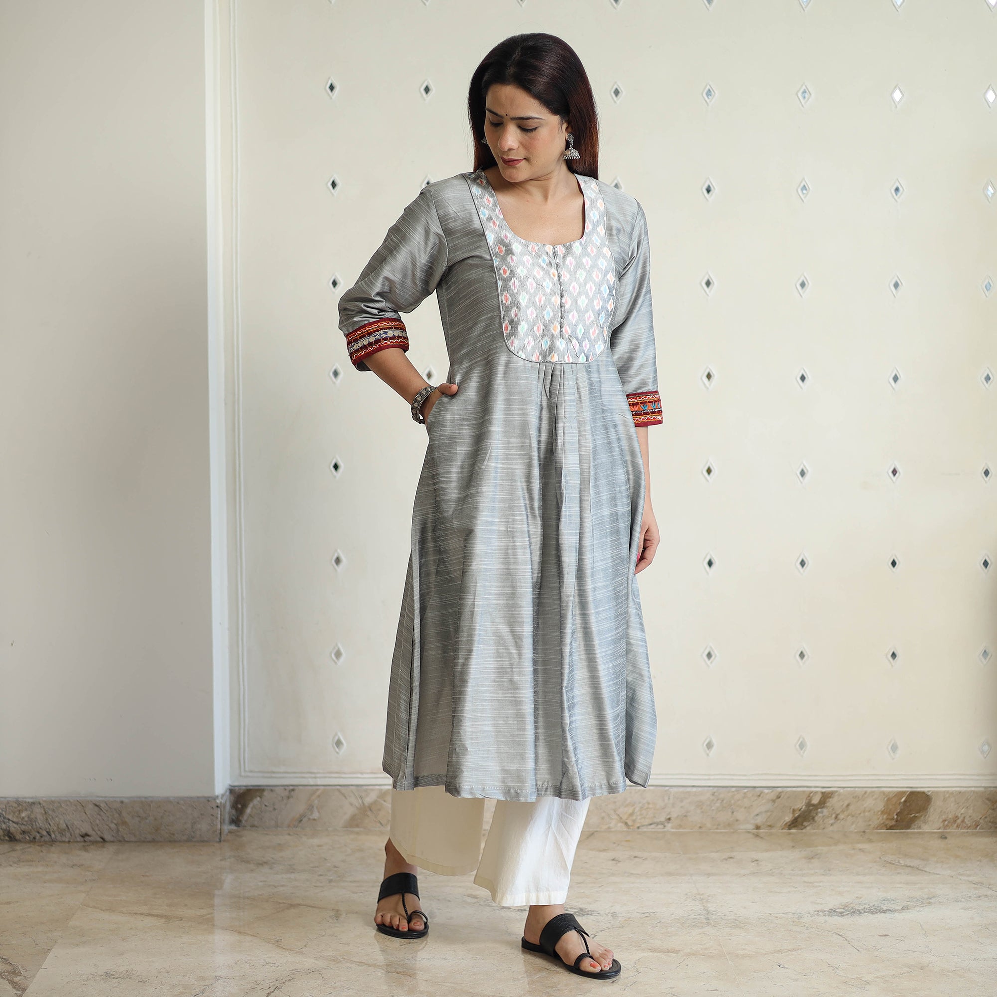 Look and feel beautiful in this uniquely designed plain slub silk kurta with ikat patchwork. This exquisite kurta is crafted from the finest quality plain slub silk fabric, ensuring a comfortable feel against your skin. It boasts an exquisite silk ikat patchwork design, adding a touch of elegance to your ensemble. The kurta also features a convenient one-side pocket, perfect for carrying small essentials. It's an ideal choice for both casual and festive occasions.