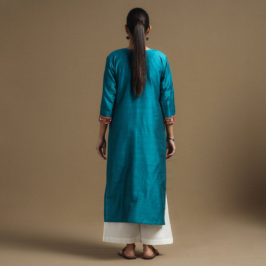 Look and feel beautiful in this uniquely designed plain slub silk pintuck kurta with ikat patchwork. This exquisite kurta is crafted from the finest quality plain slub silk fabric, ensuring a comfortable feel against your skin. It boasts an exquisite ikat pintuck patchwork design, adding a touch of elegance to your ensemble. The kurta also features a convenient one-side pocket, perfect for carrying small essentials. It's an ideal choice for both casual and festive occasions.