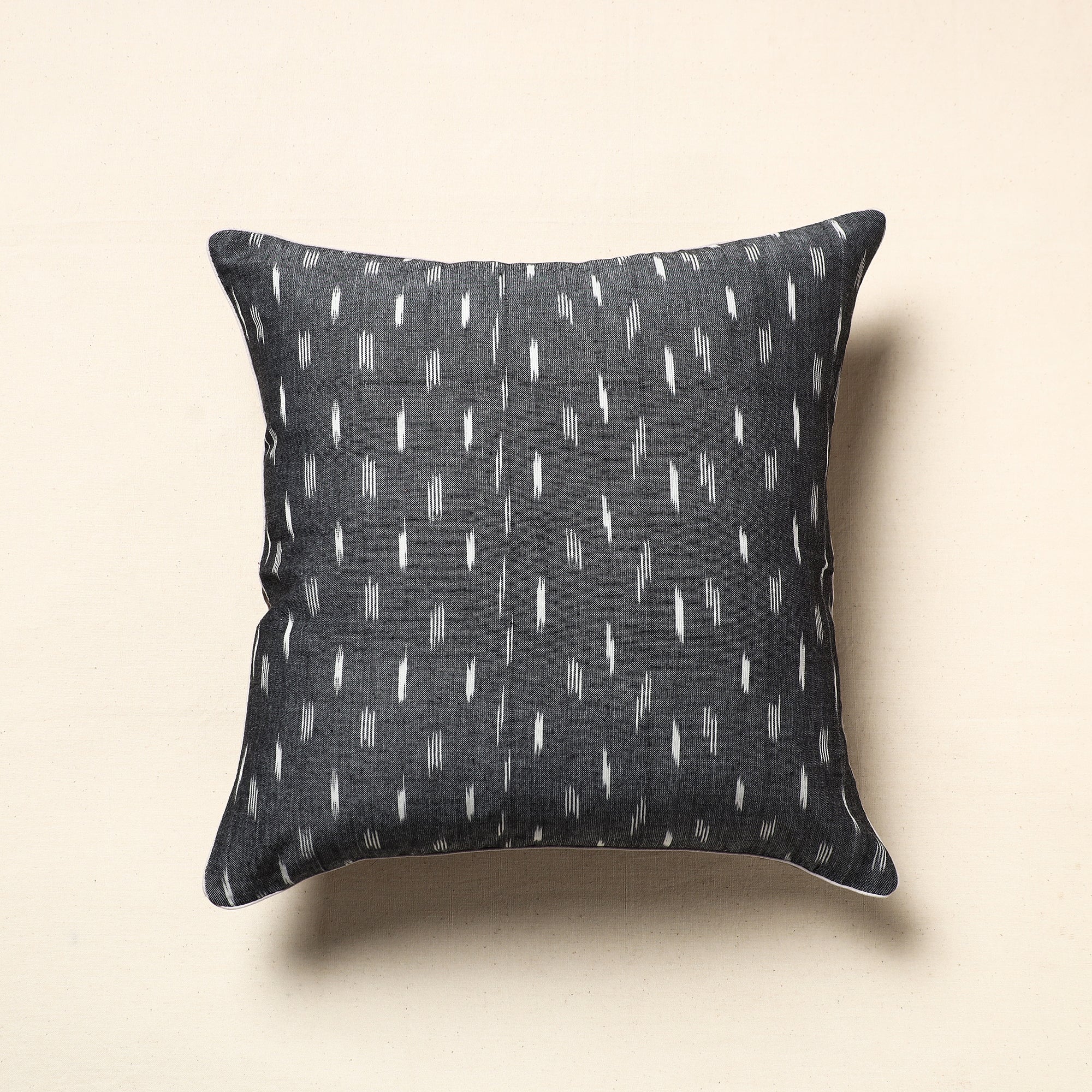 Fine quality grey pochampally ikat cotton cushion cover. Ikat has lovely patterns in extremely beautiful colours. Ikat, a dyeing technique known for its stunning patterns and vibrant colours, adds a touch of elegance to this piece. Perfect for adorning your living room or bedroom, Ikats are world famous for their colours, texture and designs.