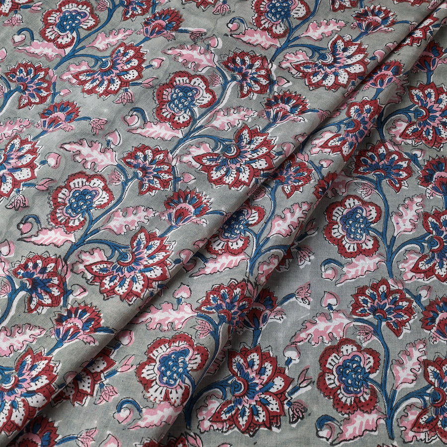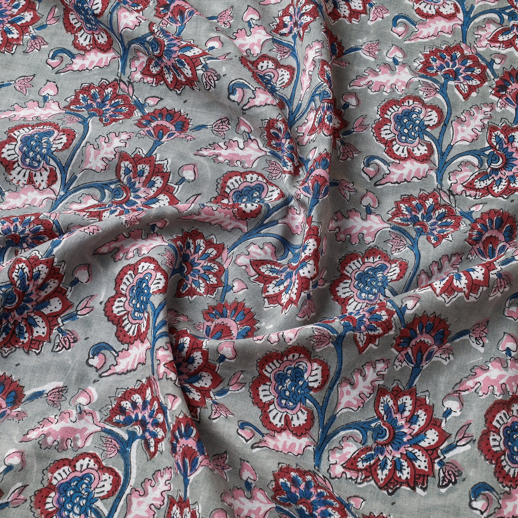 Material Fine quality red & grey floral jaal sanganeri block printed cotton fabric. sanganeri is a hand-block printing technique originating from sanganer, a village in the southern part of jaipur, rajasthan. Bleed free VAT dyes used. Perfect for creating stunning ethnic wear, sarees, dupattas, and elegant outfits that make a statement. Embrace timeless elegance with this exceptional fabric.