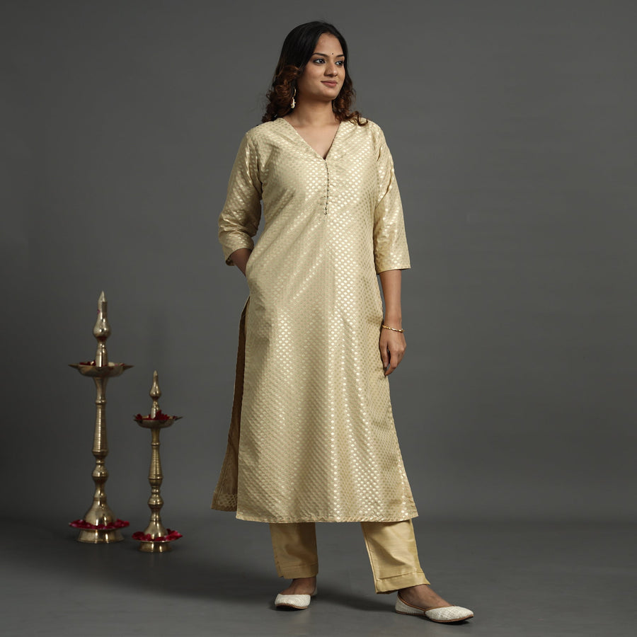 Elevate your style with our elegant banarasi brocade silk kurta and pant set. Crafted from a luxurious blend of polyester and high-quality viscose, the kurta showcases intricate detailing. The slub silk pant ensures comfort with an elasticized waist and two side pockets. A convenient one-side pocket in the kurta adds functionality. Pair with traditional accessories for a classic look or experiment with modern elements for a contemporary twist. Perfect for special occasions and celebrations, this kurta set exudes traditional charm with its elegant design.