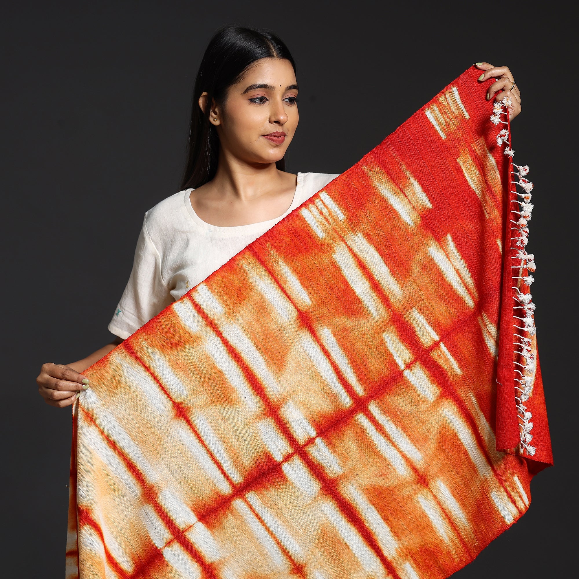 This finest-quality, pure handwoven clamp dyed shibori stole with tassels is made by skilled artisans in the Kutch region of Gujarat. Crafted with a blend of pure Katia silk and wool for a luxurious feel. Adorned with charming tassels, it's a versatile accessory suitable for any occasion. This exquisite stole is dyed with clamp dye shibori technique involving folding fabric, securing it with clamps, and dyeing to create unique patterns. Embrace the artistry of handloom craft, celebrating the skill and tradition of the Kutch region in every intricately woven thread. Elevate your style with this traditional kutchi stole, a testament to India's rich textile heritage.