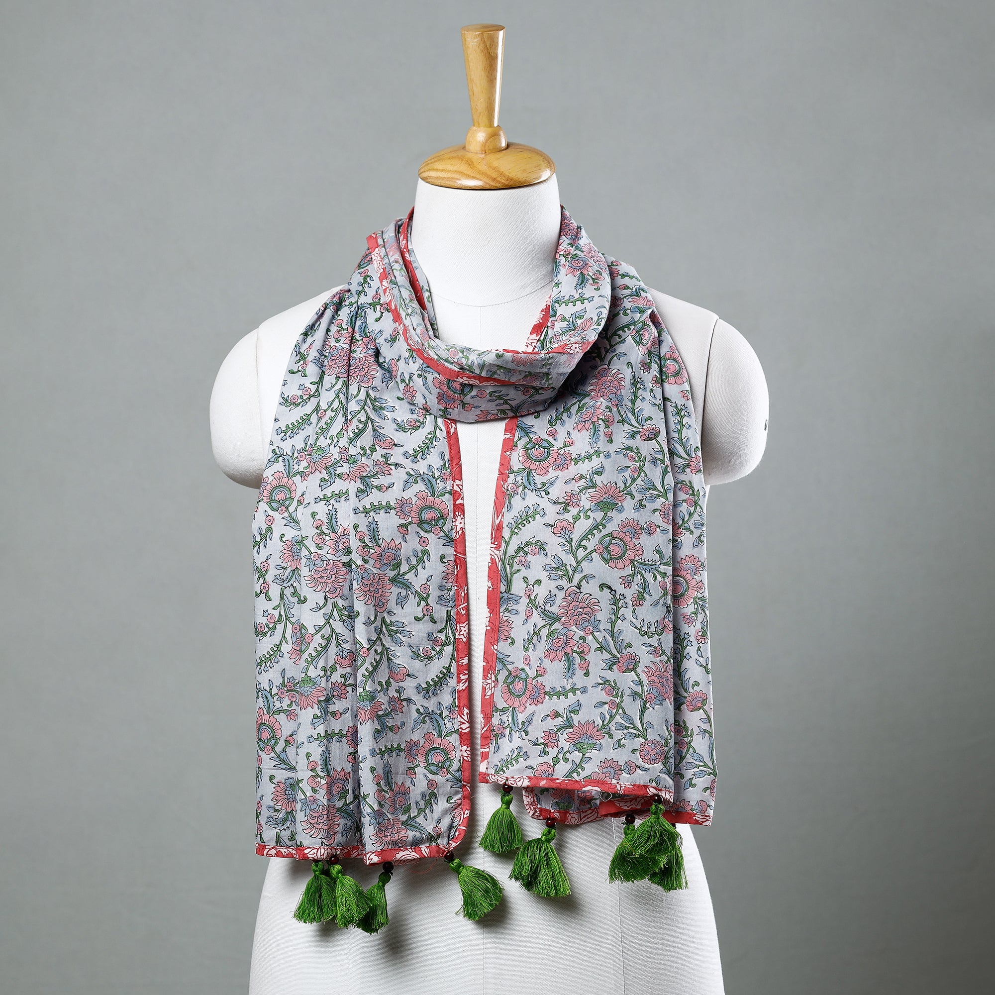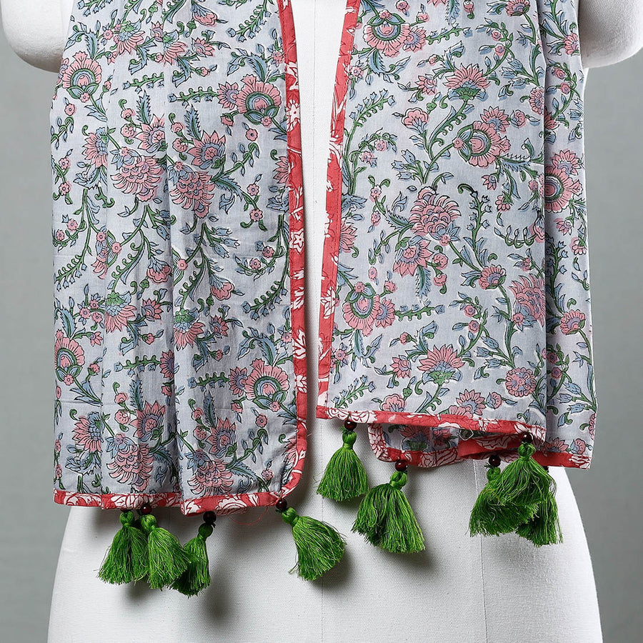 Elevate your style with this fine quality delicate floral sanganeri block printed cotton stole with tassels. This stole features intricate floral patterns, also known as 'Buttas', which are exclusive to sanganeri prints. The elaborate detailing of the flowers and petals showcases the artistry of this hand-block printing technique originating from Sanganer, Rajasthan. The use of bleed-free VAT dyes ensures the longevity and vibrancy of the colors. Add a touch of elegance to your wardrobe with this exquisite piece of craftsmanship.
