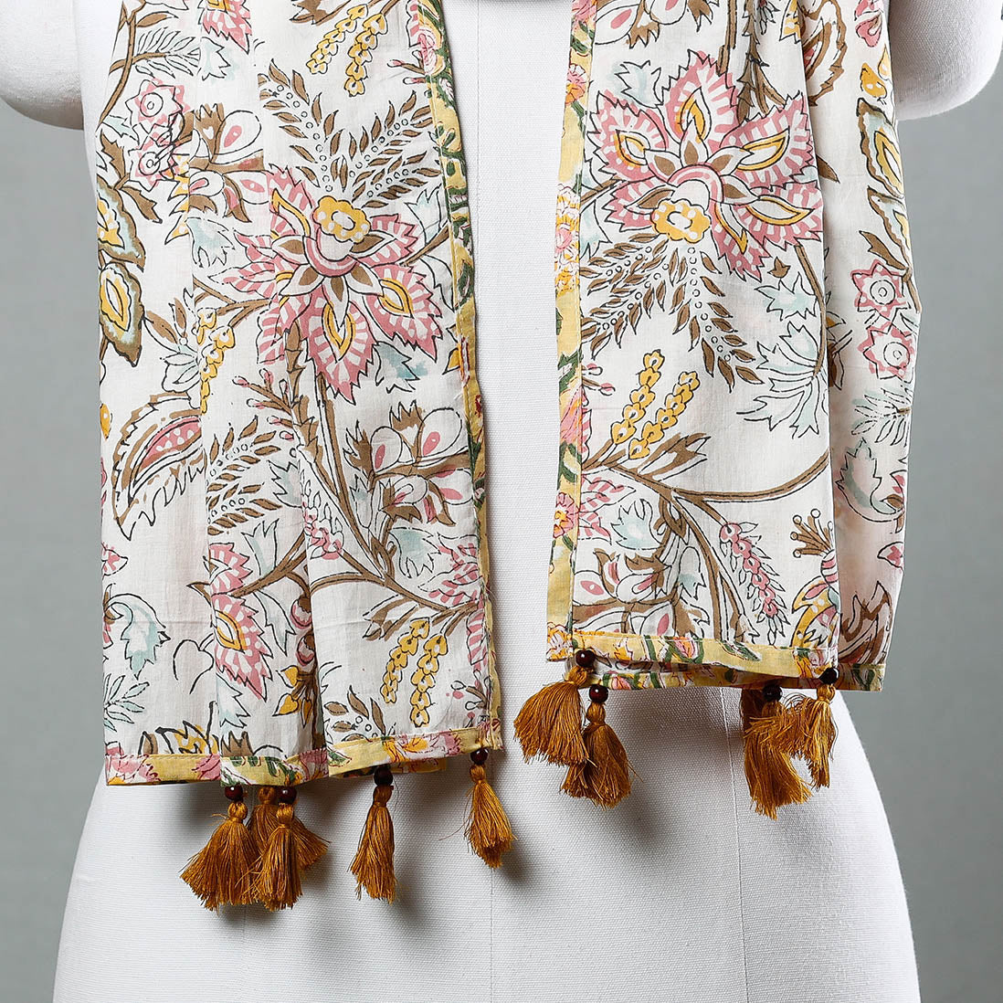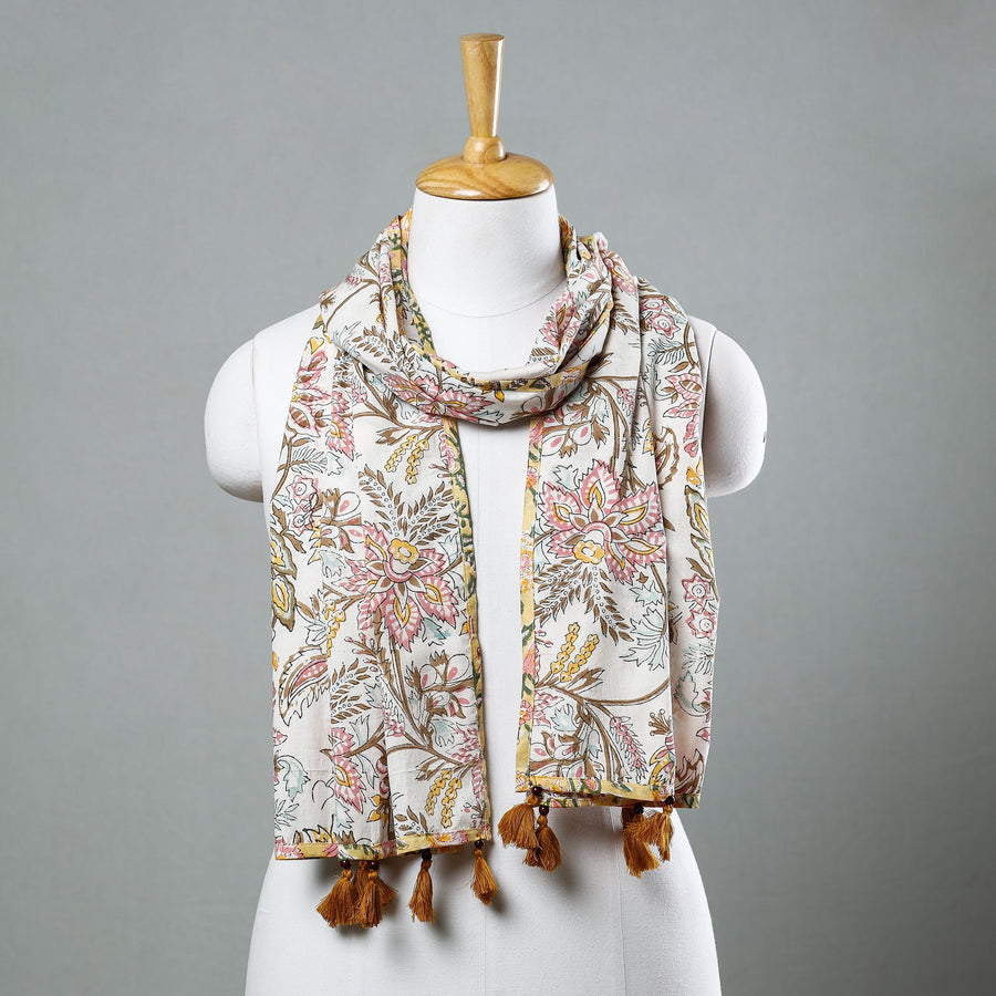 Elevate your style with this fine quality delicate floral sanganeri block printed cotton stole with tassels. This stole features intricate floral patterns, also known as 'Buttas', which are exclusive to sanganeri prints. The elaborate detailing of the flowers and petals showcases the artistry of this hand-block printing technique originating from Sanganer, Rajasthan. The use of bleed-free VAT dyes ensures the longevity and vibrancy of the colors. Add a touch of elegance to your wardrobe with this exquisite piece of craftsmanship.