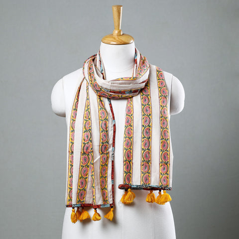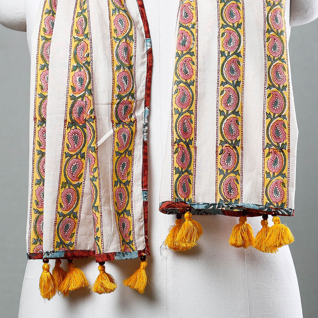 Yellow - Sanganeri Block Printed Cotton Stole with Tassels