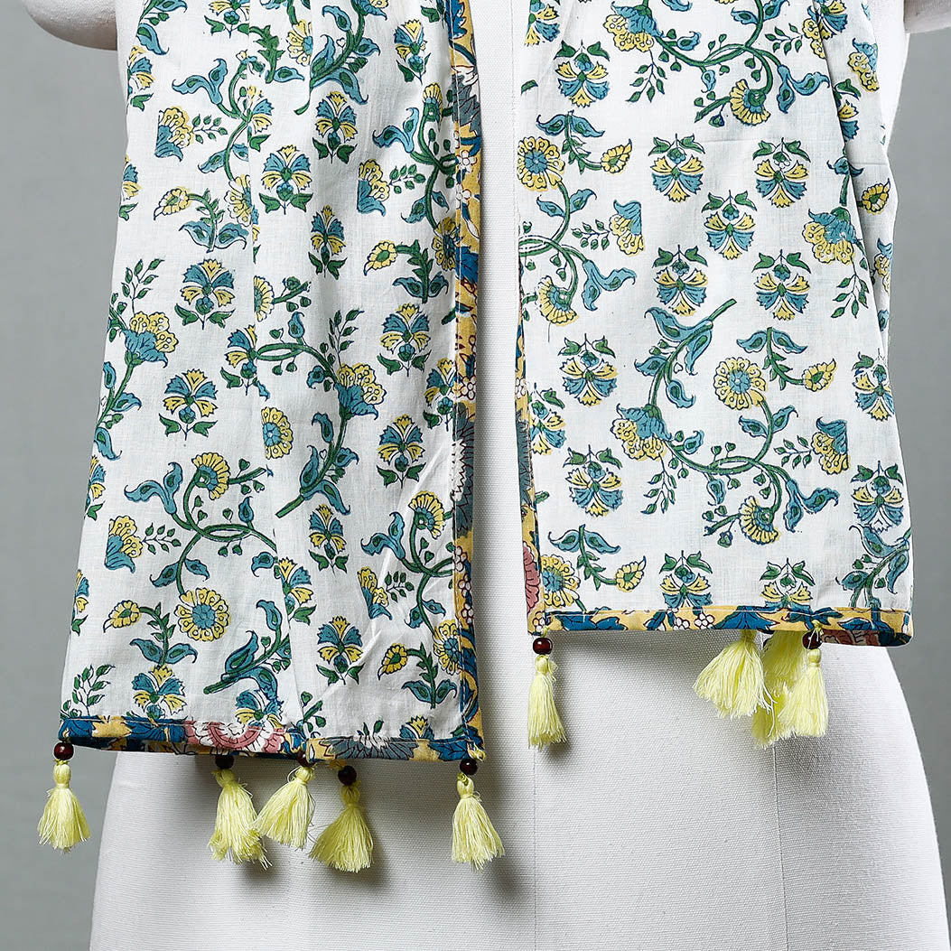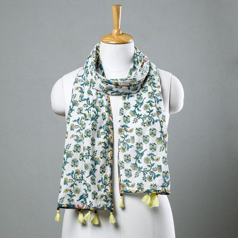 Elevate your style with this fine quality delicate floral sanganeri block printed cotton stole with tassels. This stole features intricate floral patterns, also known as 'Buttas', which are exclusive to sanganeri prints. The elaborate detailing of the flowers and petals showcases the artistry of this hand-block printing technique originating from Sanganer, Rajasthan. The use of bleed-free VAT dyes ensures the longevity and vibrancy of the colors. Add a touch of elegance to your wardrobe with this exquisite piece of craftsmanship.