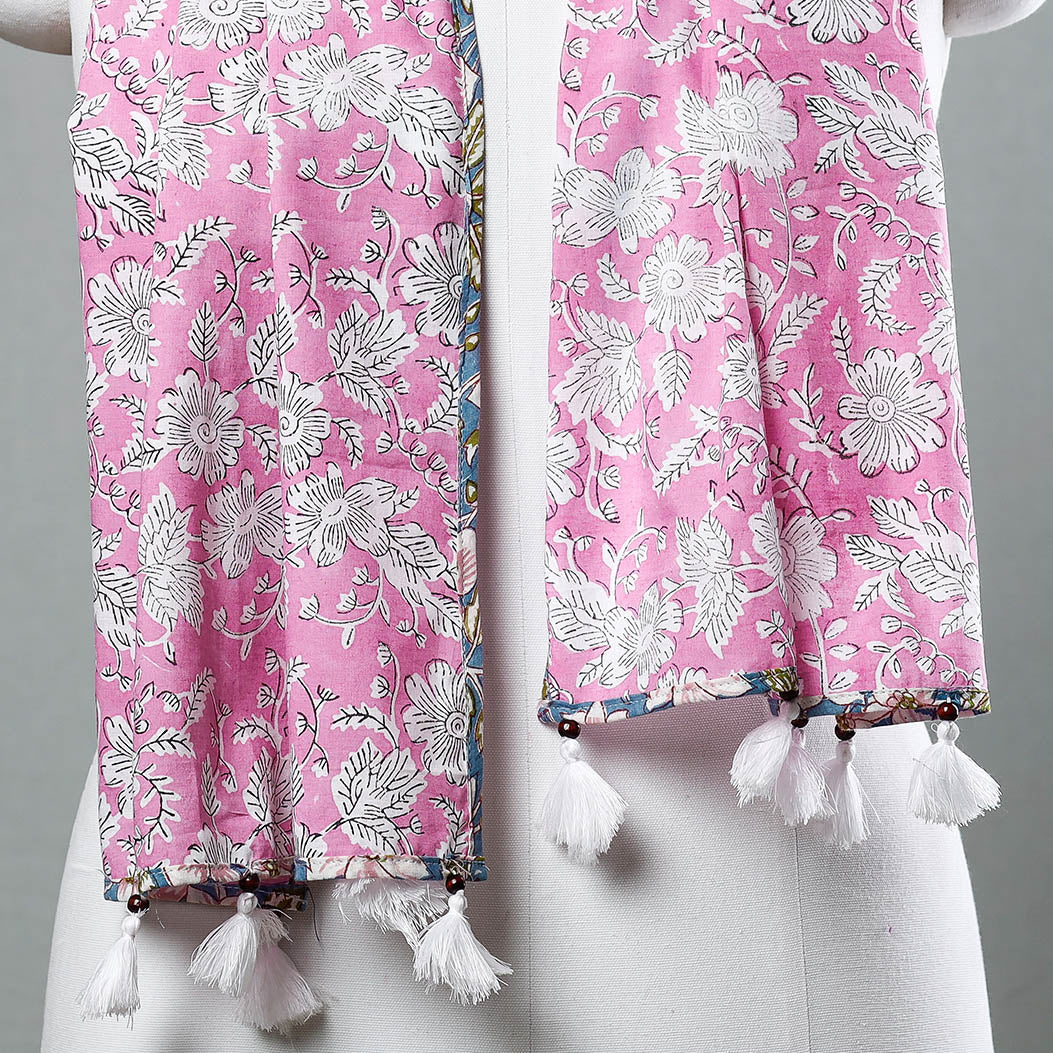 Pink - Sanganeri Block Printed Cotton Stole with Tassels