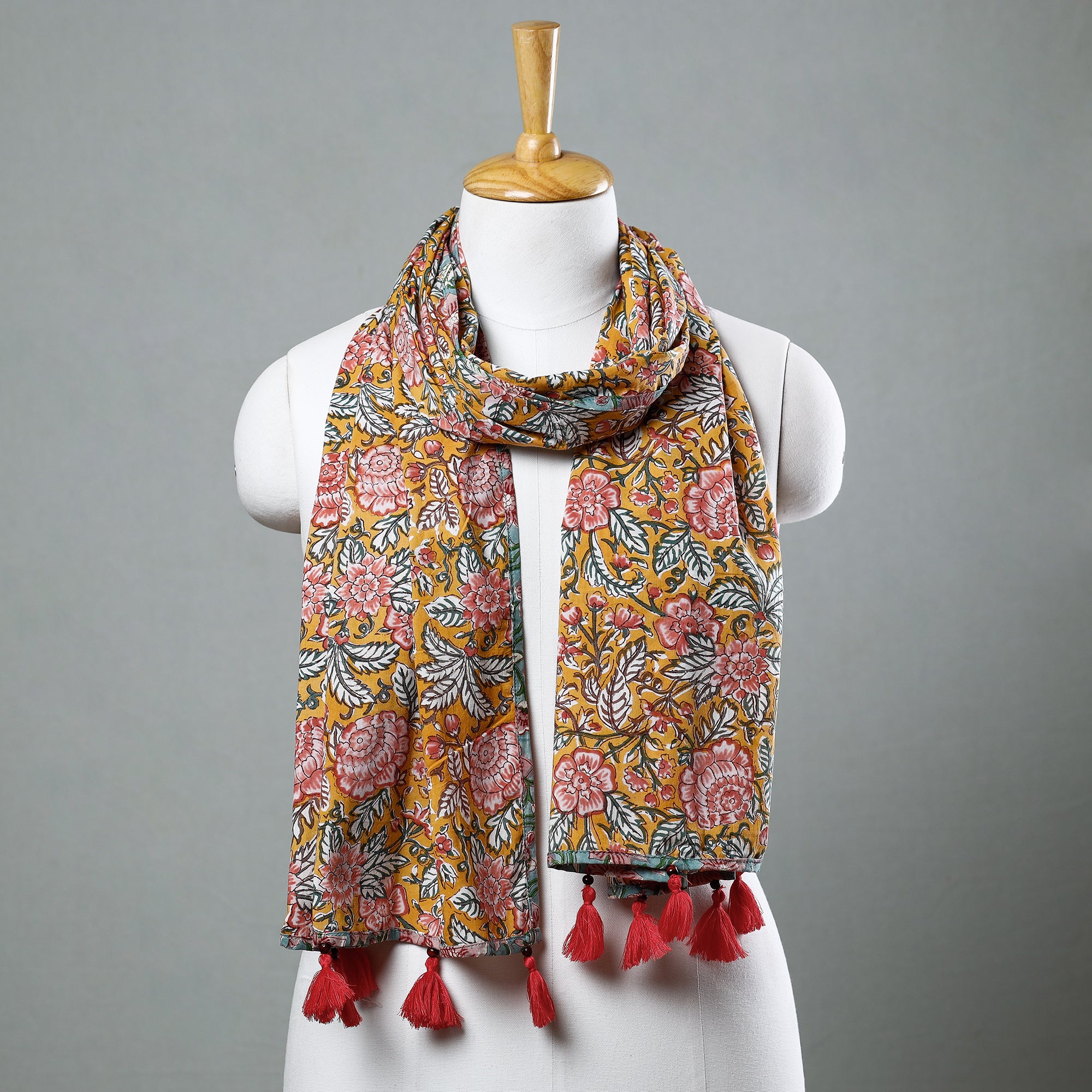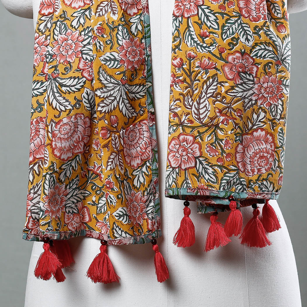 Elevate your style with this fine quality delicate floral sanganeri block printed cotton stole with tassels. This stole features intricate floral patterns, also known as 'Buttas', which are exclusive to sanganeri prints. The elaborate detailing of the flowers and petals showcases the artistry of this hand-block printing technique originating from Sanganer, Rajasthan. The use of bleed-free VAT dyes ensures the longevity and vibrancy of the colors. Add a touch of elegance to your wardrobe with this exquisite piece of craftsmanship.