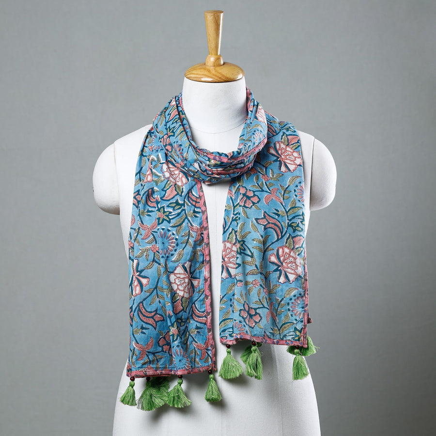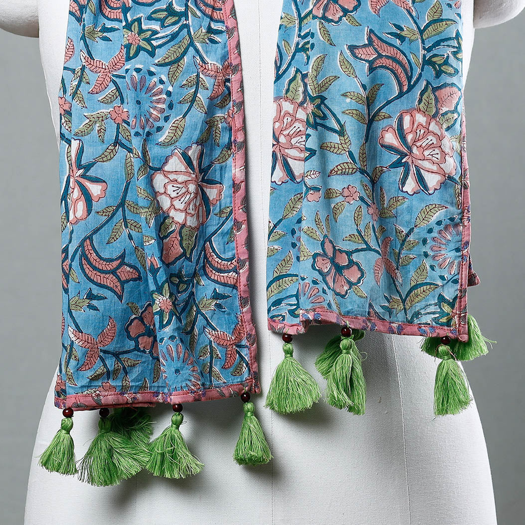 Blue - Sanganeri Block Printed Cotton Stole with Tassels