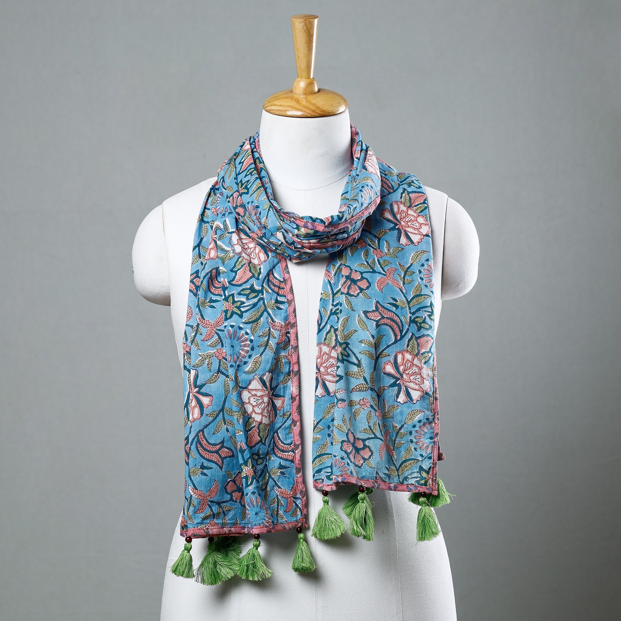 Elevate your style with this fine quality delicate floral sanganeri block printed cotton stole with tassels. This stole features intricate floral patterns, also known as 'Buttas', which are exclusive to sanganeri prints. The elaborate detailing of the flowers and petals showcases the artistry of this hand-block printing technique originating from Sanganer, Rajasthan. The use of bleed-free VAT dyes ensures the longevity and vibrancy of the colors. Add a touch of elegance to your wardrobe with this exquisite piece of craftsmanship.