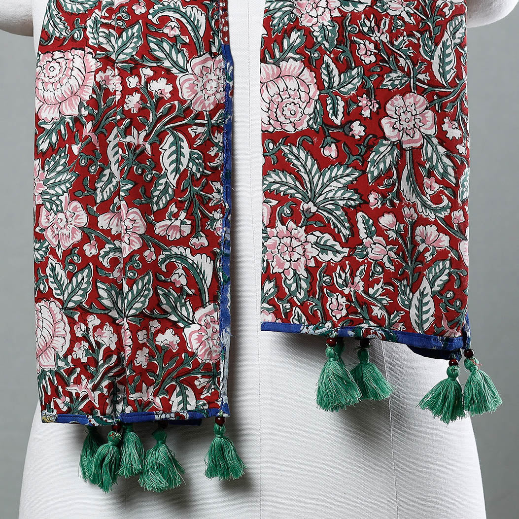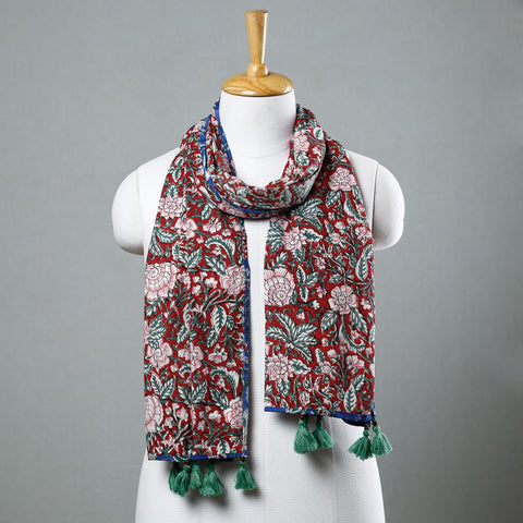 Maroon - Sanganeri Block Printed Cotton Stole with Tassels