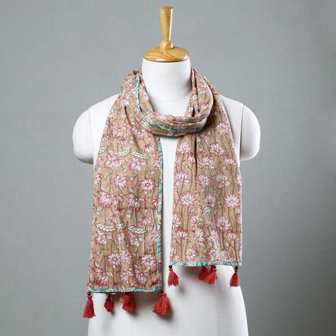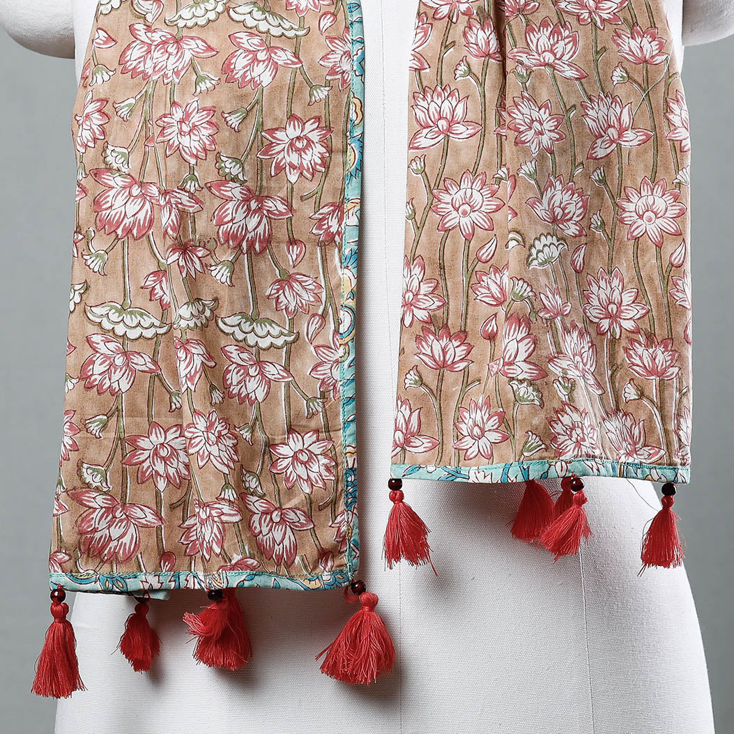 Elevate your style with this fine quality delicate floral sanganeri block printed cotton stole with tassels. This stole features intricate floral patterns, also known as 'Buttas', which are exclusive to sanganeri prints. The elaborate detailing of the flowers and petals showcases the artistry of this hand-block printing technique originating from Sanganer, Rajasthan. The use of bleed-free VAT dyes ensures the longevity and vibrancy of the colors. Add a touch of elegance to your wardrobe with this exquisite piece of craftsmanship.