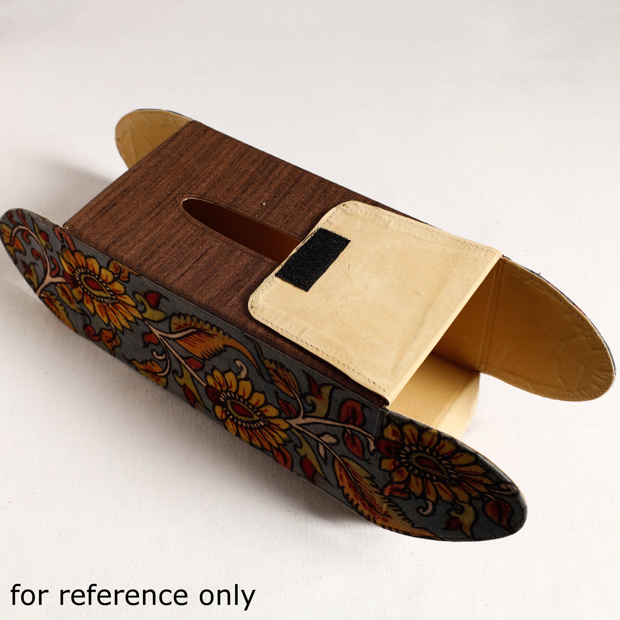 Elevate your home decor with our handcrafted kalamkari natural-dyed cotton tissue box. Soft velvet fabric has been used inside the box. Made from thin craft board and emblished with intricate hand-painted kalamkari cotton and plain ghicha silk fabric, this exquisite piece brings traditional artistry to your space. The use of the "kalam" (bamboo stick) technique ensures freehand drawing with natural colours, making it a unique and eco-friendly addition. Add a touch of culture to your surroundings with this functional and artistic tissue box.