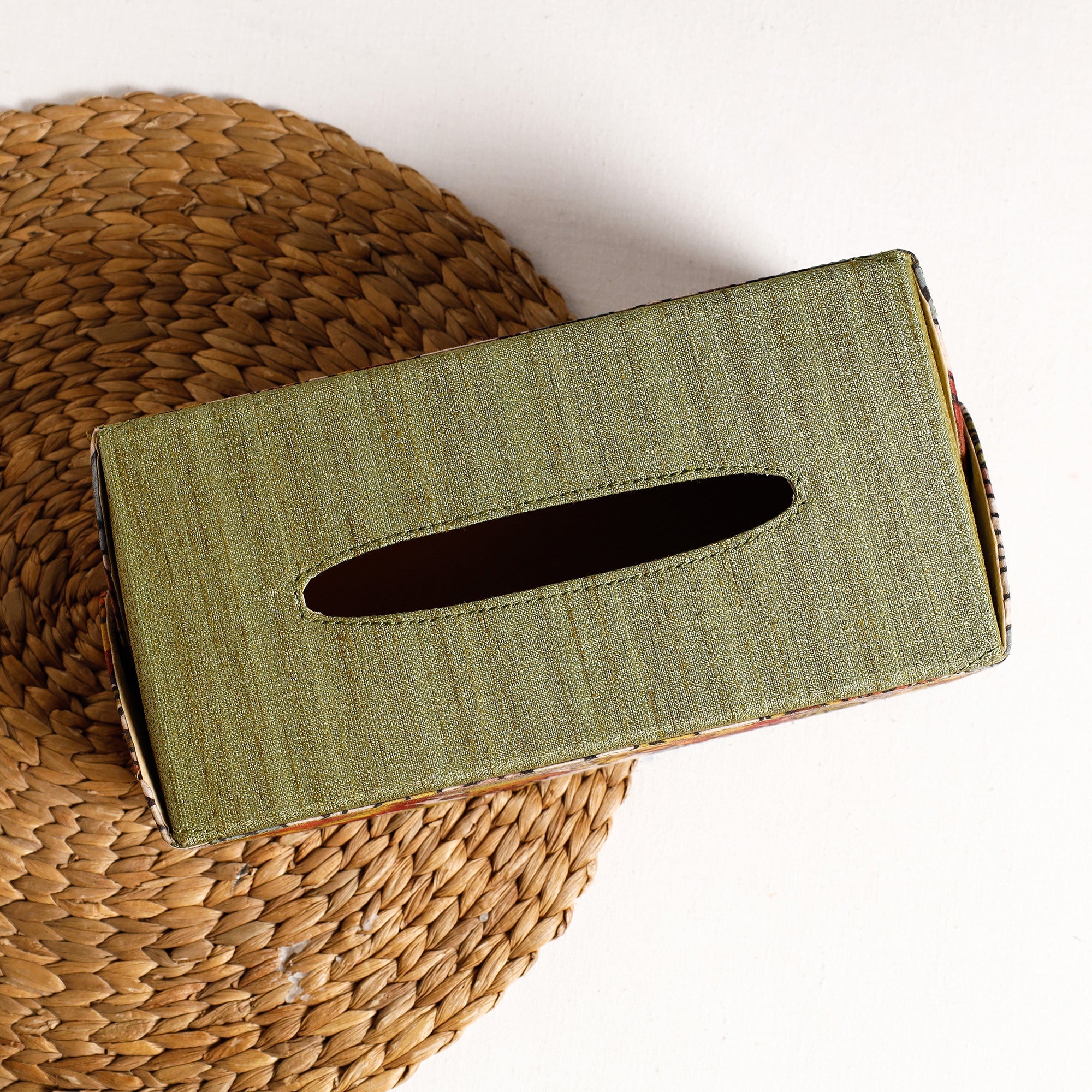 Elevate your home decor with our green handcrafted kalamkari natural-dyed cotton tissue box. Soft velvet fabric has been used inside the box. Made from thin craft board and emblished with intricate hand-painted kalamkari cotton and plain ghicha silk fabric, this exquisite piece brings traditional artistry to your space. The use of the "kalam" (bamboo stick) technique ensures freehand drawing with natural colours, making it a unique and eco-friendly addition. Add a touch of culture to your surroundings with this functional and artistic tissue box.