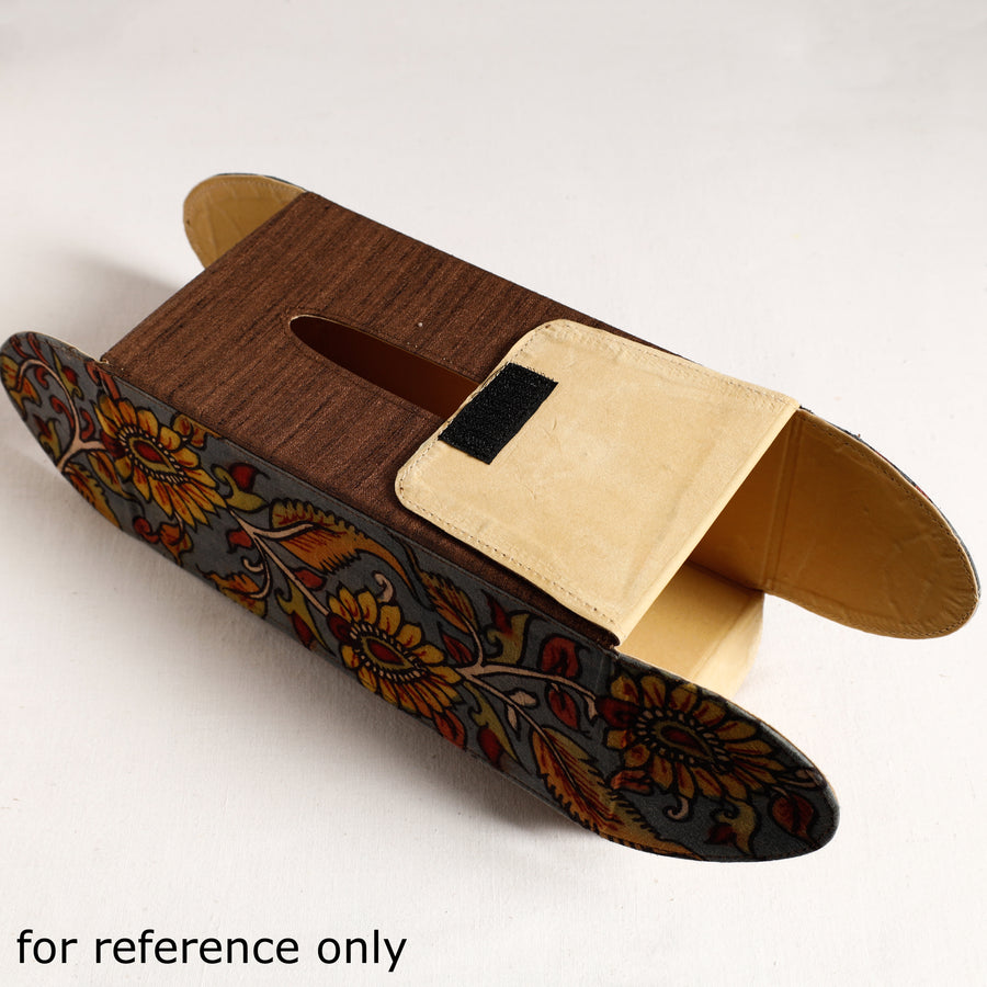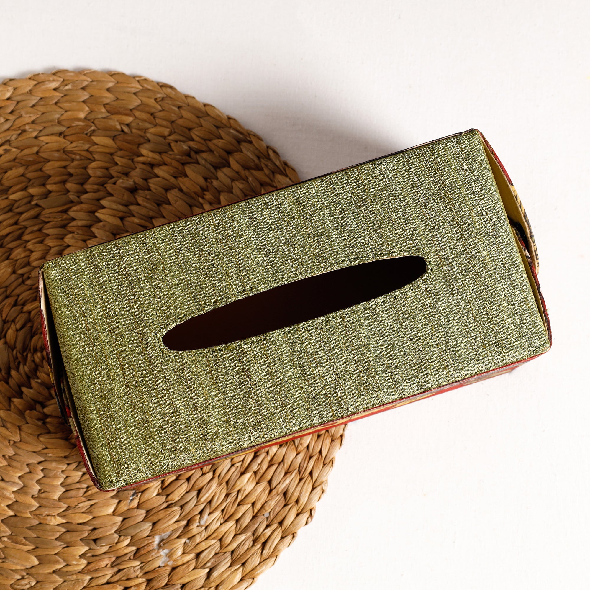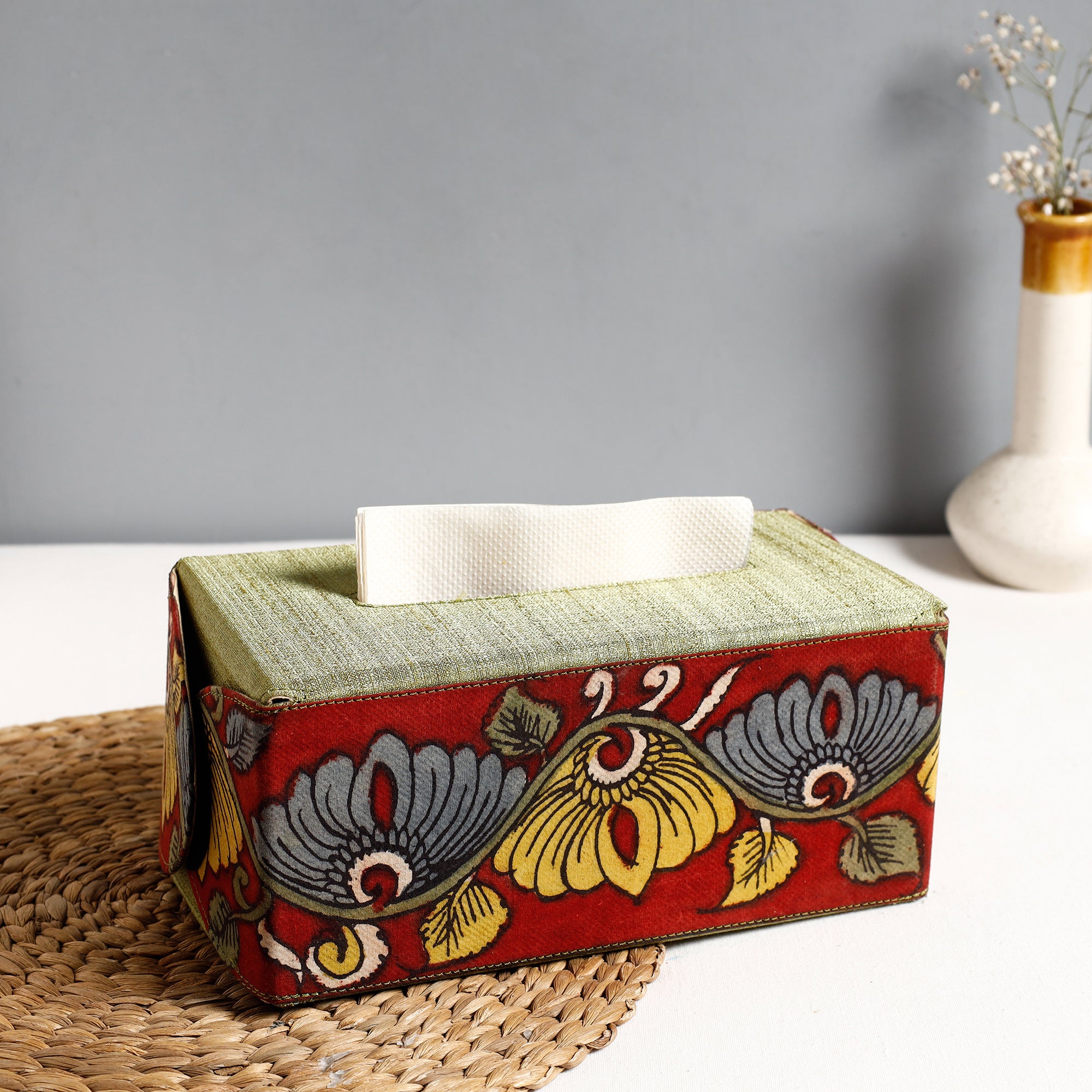 Elevate your home decor with our green handcrafted kalamkari natural-dyed cotton tissue box. Soft velvet fabric has been used inside the box. Made from thin craft board and emblished with intricate hand-painted kalamkari cotton and plain ghicha silk fabric, this exquisite piece brings traditional artistry to your space. The use of the "kalam" (bamboo stick) technique ensures freehand drawing with natural colours, making it a unique and eco-friendly addition. Add a touch of culture to your surroundings with this functional and artistic tissue box.