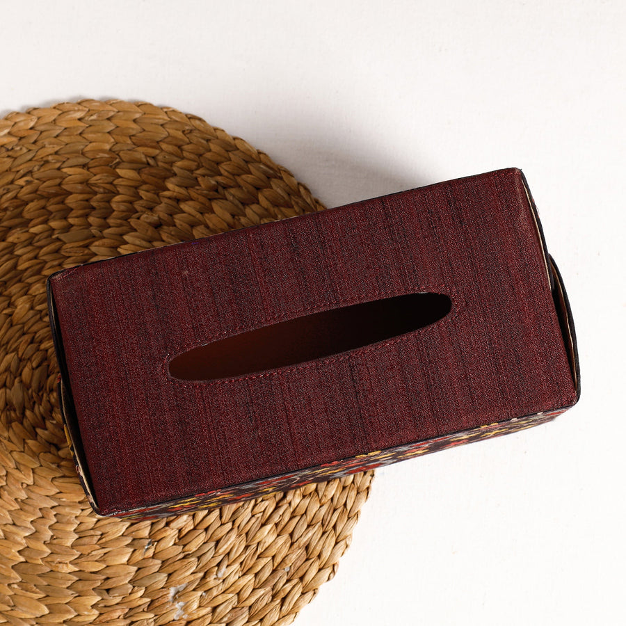 Elevate your home decor with our brown handcrafted kalamkari natural-dyed cotton tissue box. Soft velvet fabric has been used inside the box. Made from thin craft board and emblished with intricate hand-painted kalamkari cotton and plain ghicha silk fabric, this exquisite piece brings traditional artistry to your space. The use of the "kalam" (bamboo stick) technique ensures freehand drawing with natural colours, making it a unique and eco-friendly addition. Add a touch of culture to your surroundings with this functional and artistic tissue box.