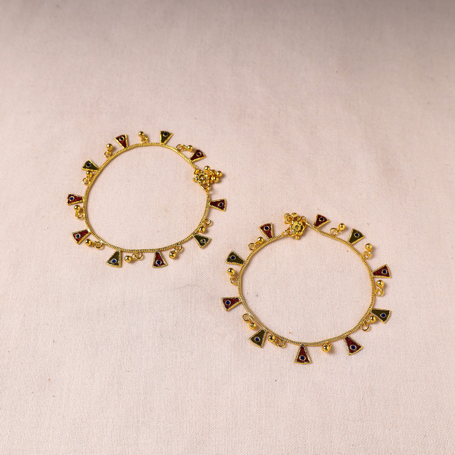 Experience the allure of tradition with Sukhomoy Mukherjee's handcrafted Paka Meenakari anklets. Meticulously crafted from a bronze alloy, these anklets showcase the ancient art of Meenakari, where vibrant colours fuse into intricate designs. Meenakari is the art of colouring and ornamenting the surface of metals by fusing over them brilliant colours that are decorated in an intricate design. The Mughals invented the art of enamel or meenawork metalcraft, and it was popular with both the Mughals and the Hindu princes of Rajasthan, where it was used for creating precious objects and enriching jewellery.