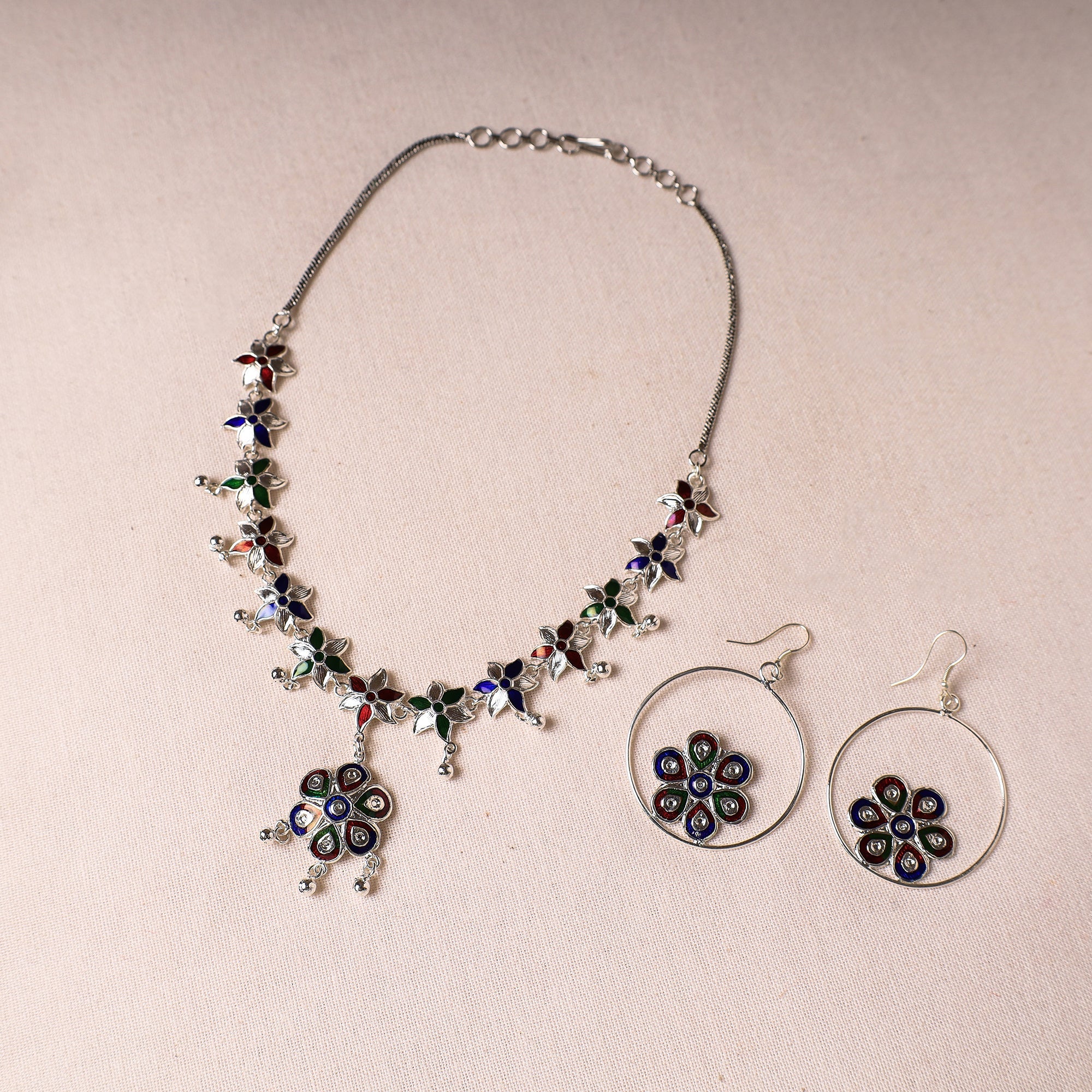 Experience the allure of tradition with Sukhomoy Mukherjee's white handcrafted Paka Meenakari necklace set. Meticulously crafted from a bronze alloy, this necklace set showcase the ancient art of Meenakari, where vibrant colours fuse into intricate designs. Meenakari is the art of colouring and ornamenting the surface of metals by fusing over them brilliant colours that are decorated in an intricate design. The Mughals invented the art of enamel or meenawork metalcraft, and it was popular with both the Mughals and the Hindu princes of Rajasthan, where it was used for creating precious objects and enriching jewellery.