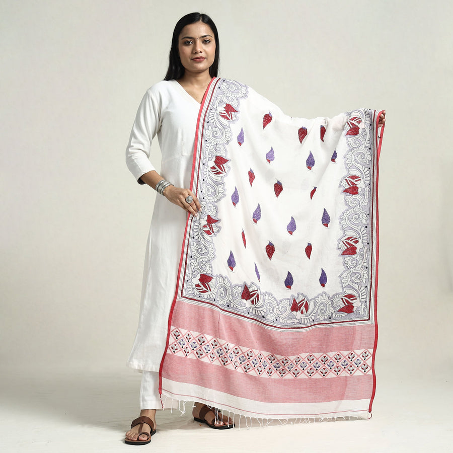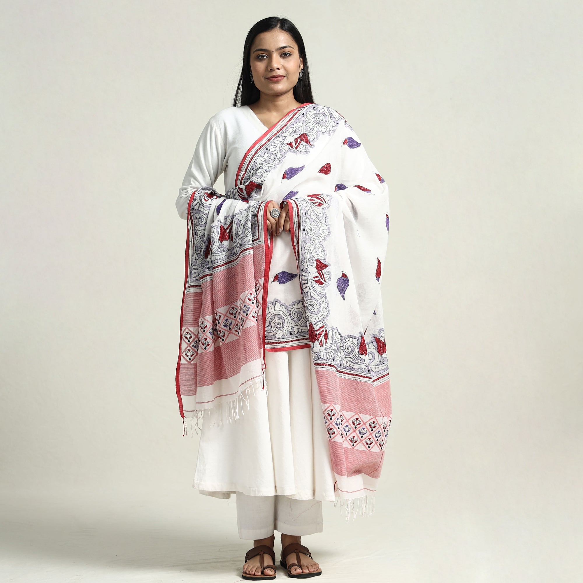 Adorn yourself with the timeless elegance of this pure cotton handloom tassels dupatta skillfully hand-embroidered using Bengal's traditional kantha technique by master artisan takdira begum from Bolpur, West Bengal. Each stitch narrates the region's rich cultural heritage. This dupatta is perfect for both casual and formal wear, it's a versatile addition to your wardrobe.