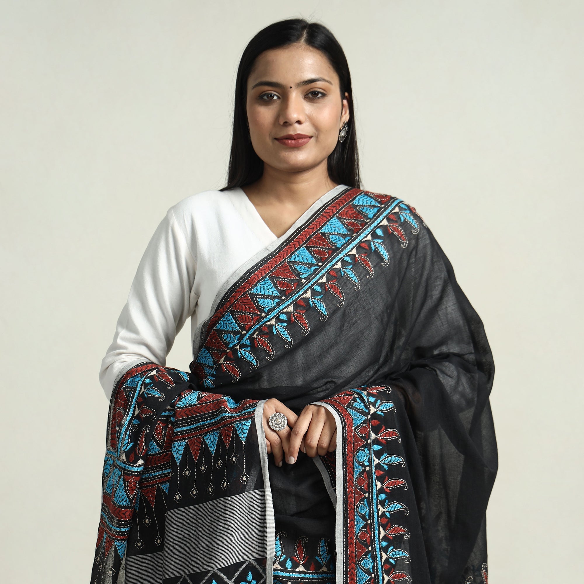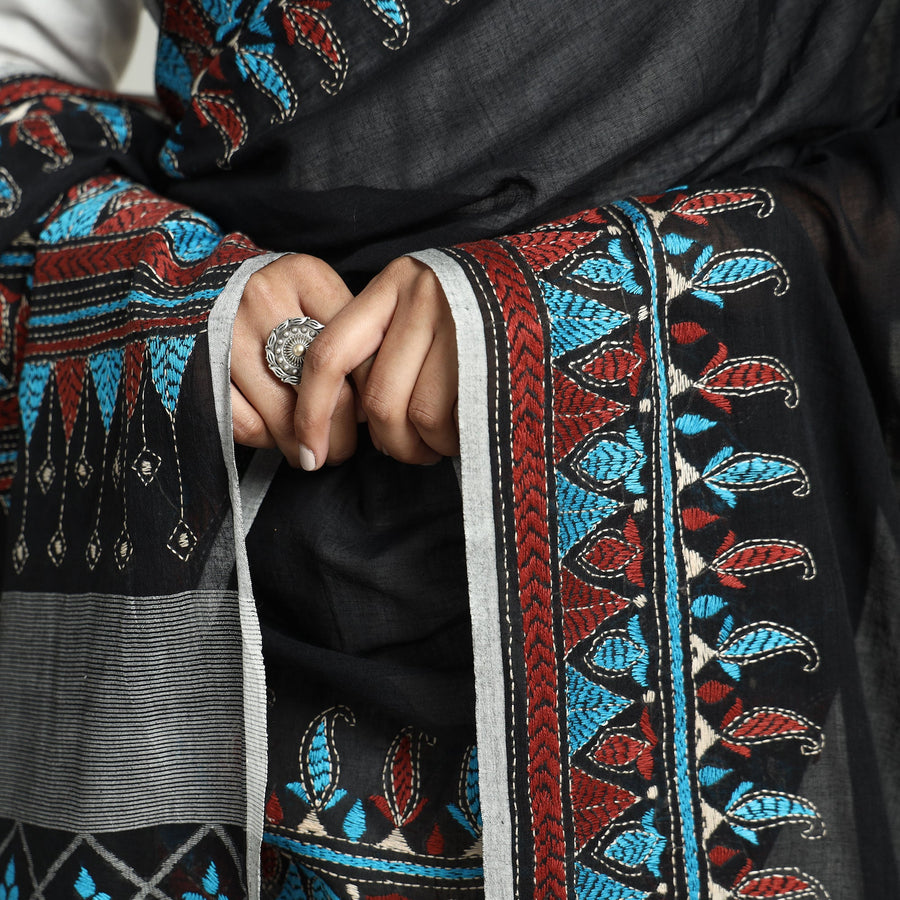 Adorn yourself with the timeless elegance of this pure cotton handloom tassels dupatta skillfully hand-embroidered using Bengal's traditional kantha technique by master artisan takdira begum from Bolpur, West Bengal. Each stitch narrates the region's rich cultural heritage. This dupatta is perfect for both casual and formal wear, it's a versatile addition to your wardrobe.