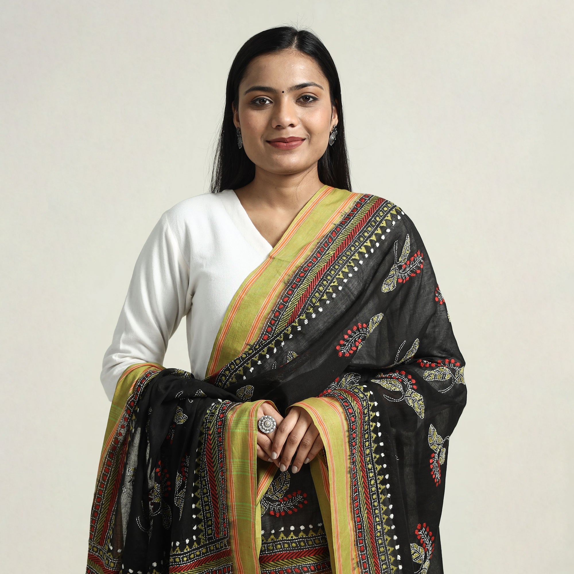 Adorn yourself with the timeless elegance of this pure cotton handloom tassels dupatta skillfully hand-embroidered using Bengal's traditional kantha technique by master artisan takdira begum from Bolpur, West Bengal. Each stitch narrates the region's rich cultural heritage. This dupatta is perfect for both casual and formal wear, it's a versatile addition to your wardrobe.