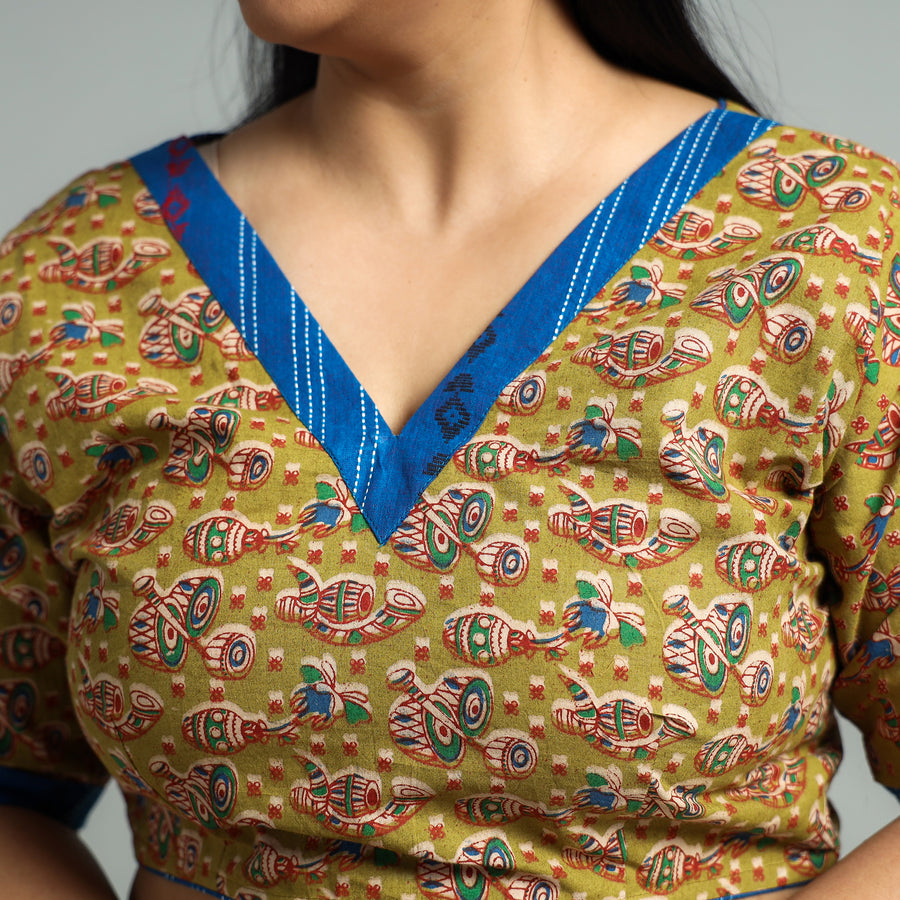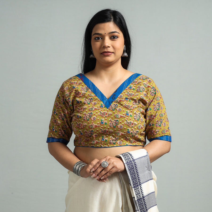 Elevate your style effortlessly with our exquisite kalamkari printed cotton stitched blouse with unique sleeve patch. It features elegant half sleeves that provide balanced coverage, making it perfect for any occasion. The hook lock adds convenience and allows for easy wear and removal.This versatile piece seamlessly blends traditional charm with contemporary flair. Perfect for pairing with sarees or skirts, the blouse adds a touch of sophistication to any ensemble. Embrace the artistry of Kalamkari while enjoying comfort and style in this beautifully crafted, ready-to-wear blouse.