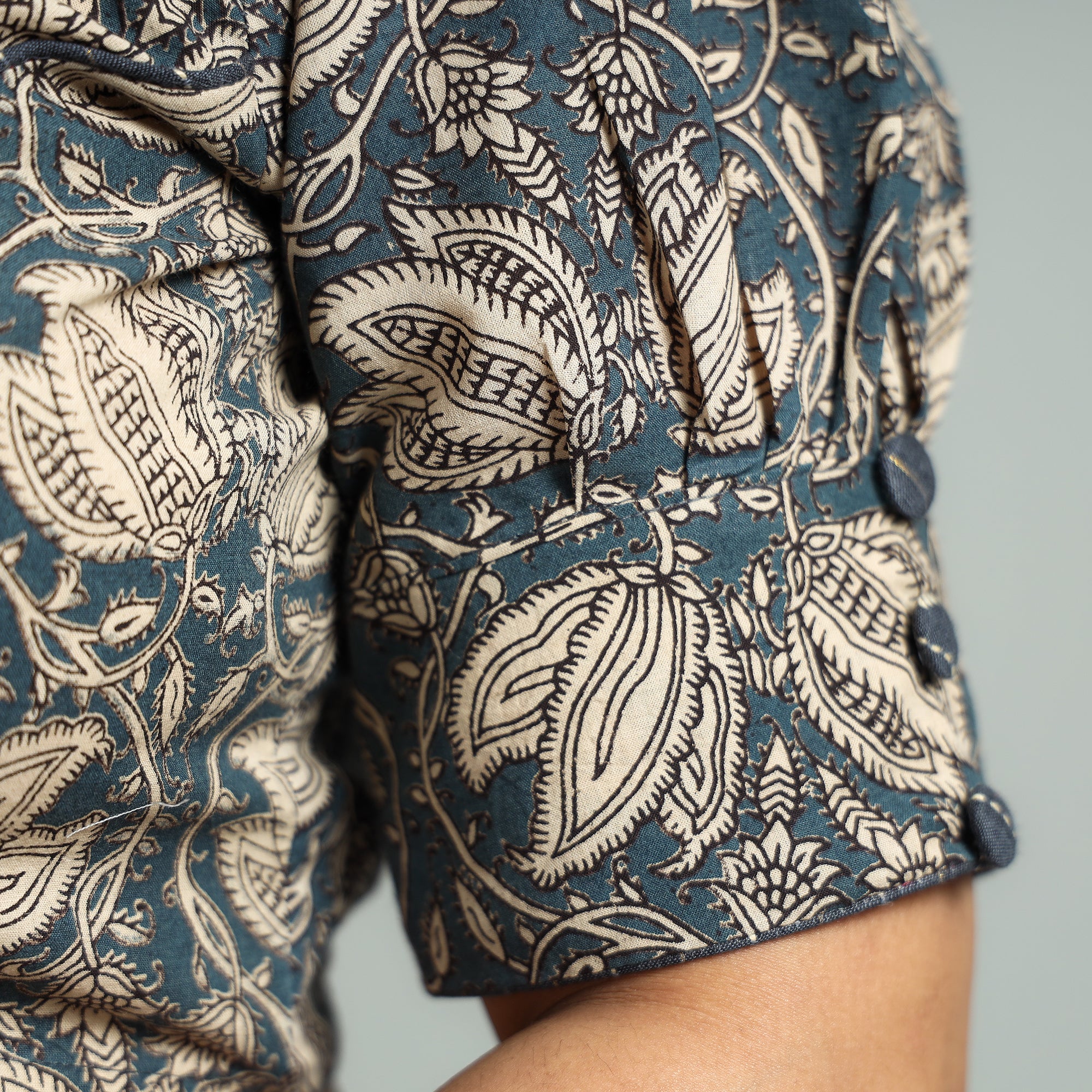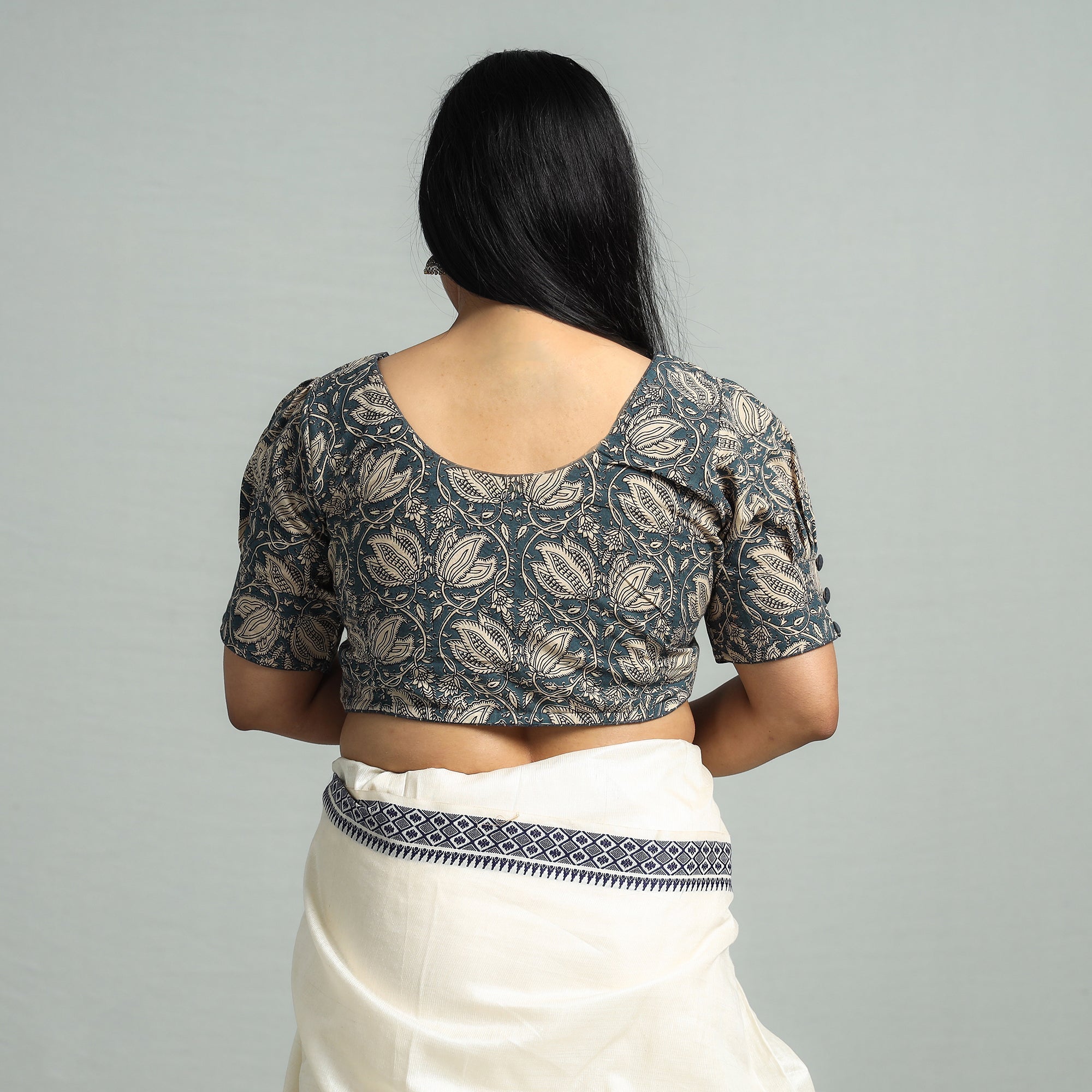 Elevate your style effortlessly with our exquisite kalamkari printed cotton stitched blouse with unique sleeve patch. It features elegant half sleeves that provide balanced coverage, making it perfect for any occasion. The hook lock adds convenience and allows for easy wear and removal.This versatile piece seamlessly blends traditional charm with contemporary flair. Perfect for pairing with sarees or skirts, the blouse adds a touch of sophistication to any ensemble. Embrace the artistry of Kalamkari while enjoying comfort and style in this beautifully crafted, ready-to-wear blouse.