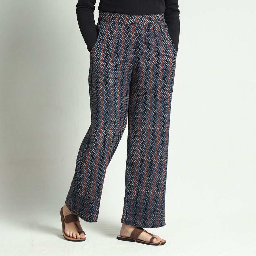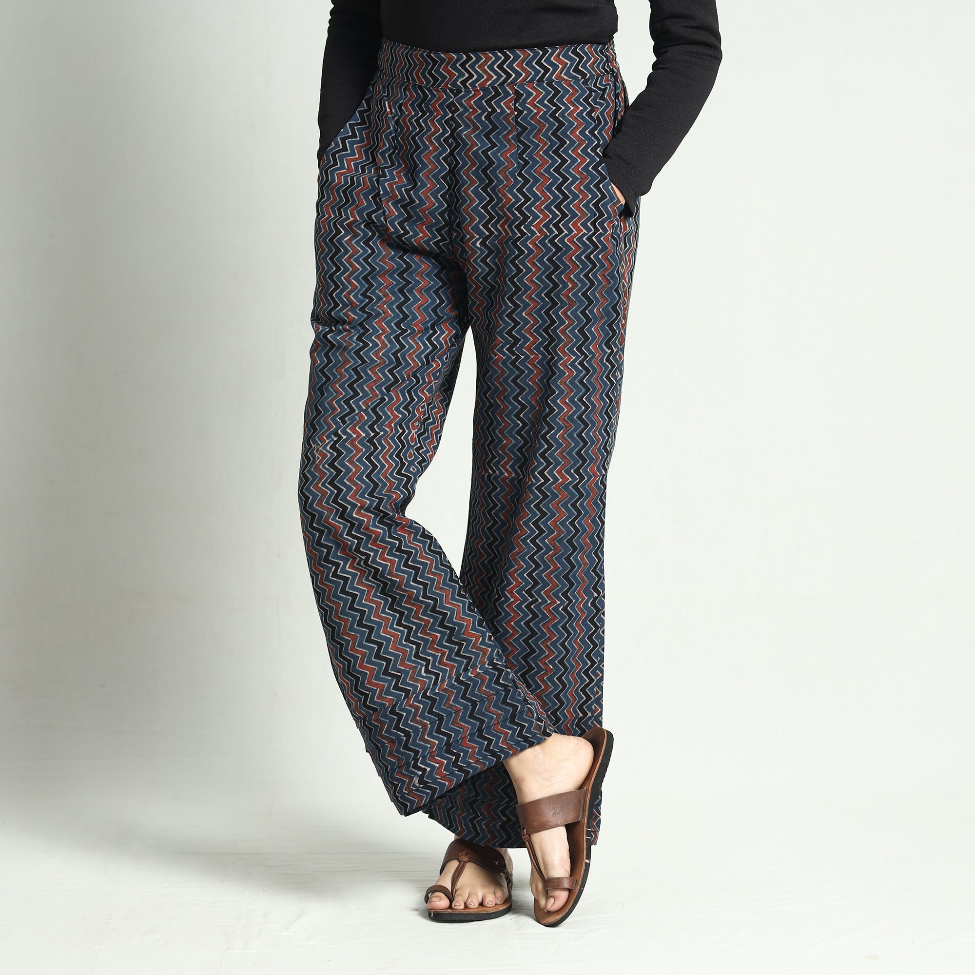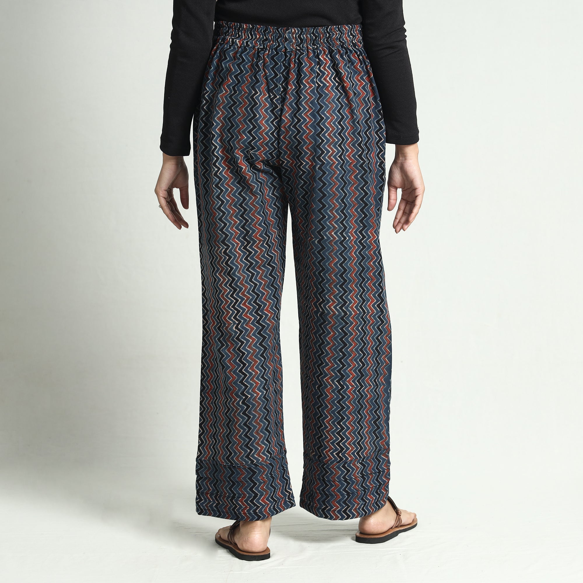 Stay comfortable and stylish in this ajrakh block printed cotton elasticated palazzo. Made from cotton fabric. This palazzo offers the perfect blend of comfort and style. The elasticized waist ensures a great fit, while the two side pockets add functionality. This palazzo makes you feel comfortable and stylish all day long and is perfect for your daily outings and special occasions.