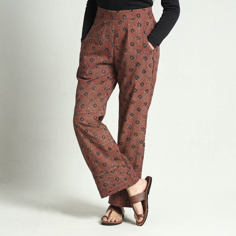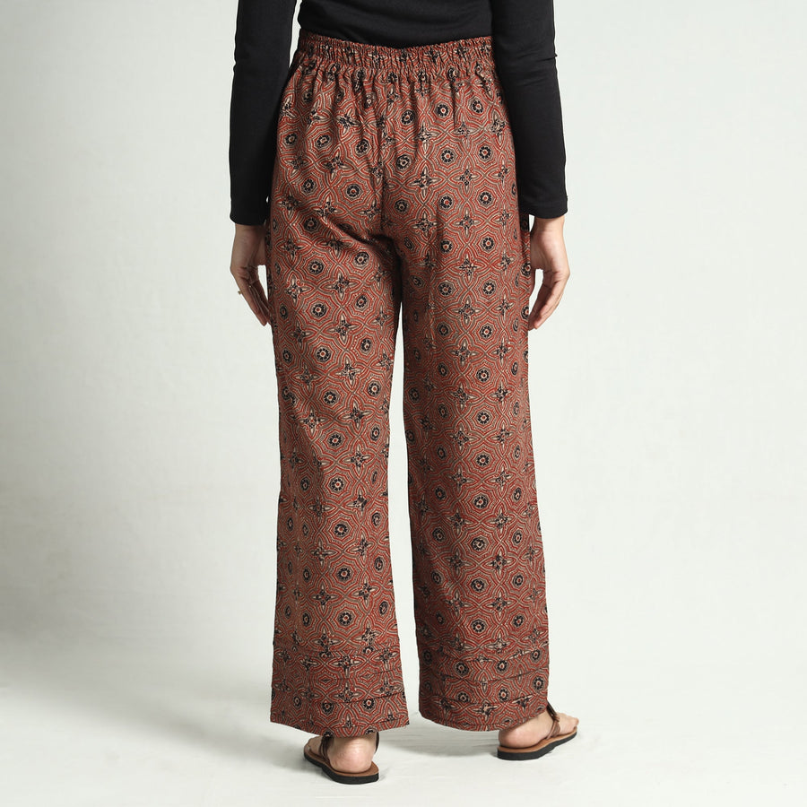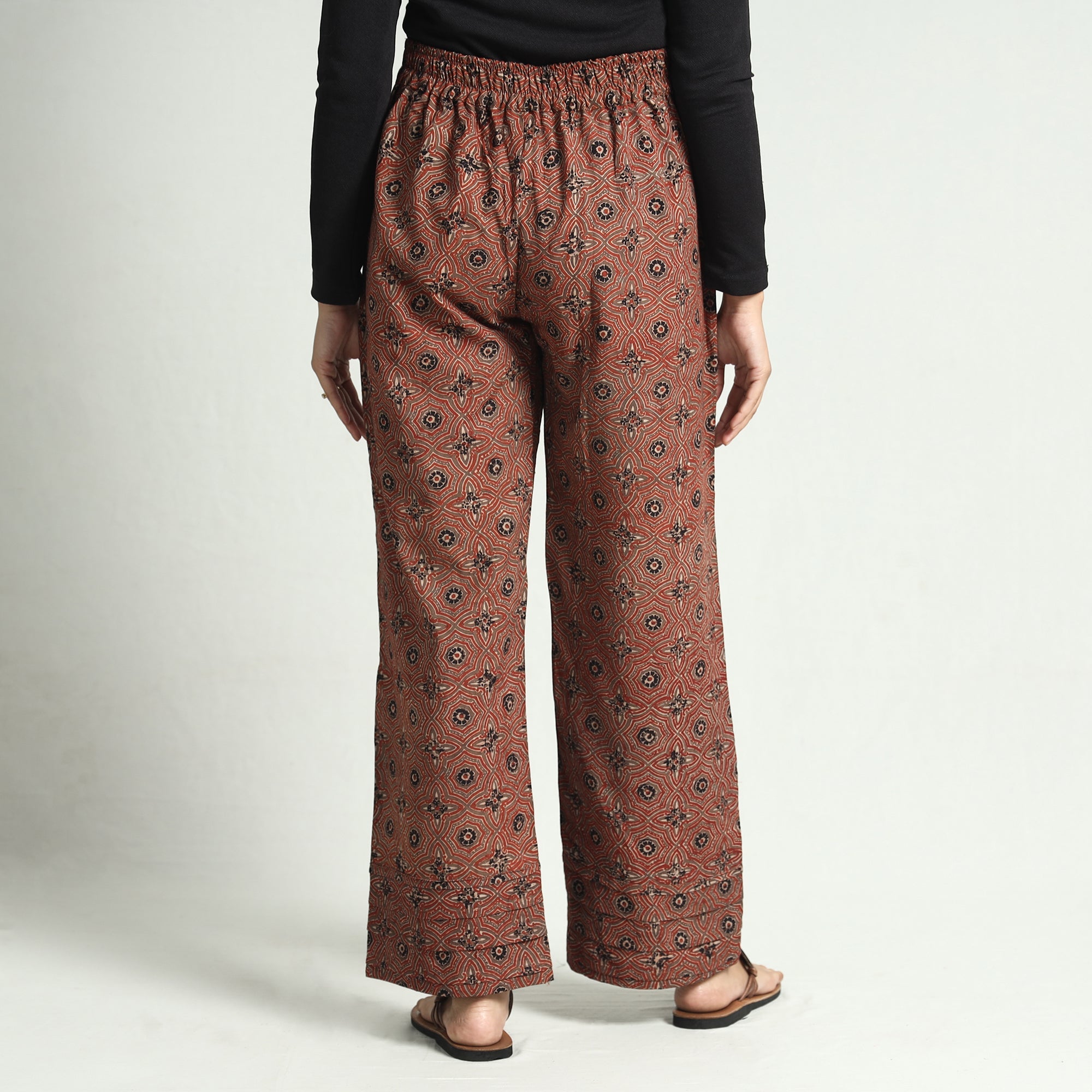Stay comfortable and stylish in this ajrakh block printed cotton elasticated palazzo. Made from cotton fabric. This palazzo offers the perfect blend of comfort and style. The elasticized waist ensures a great fit, while the two side pockets add functionality. This palazzo makes you feel comfortable and stylish all day long and is perfect for your daily outings and special occasions.