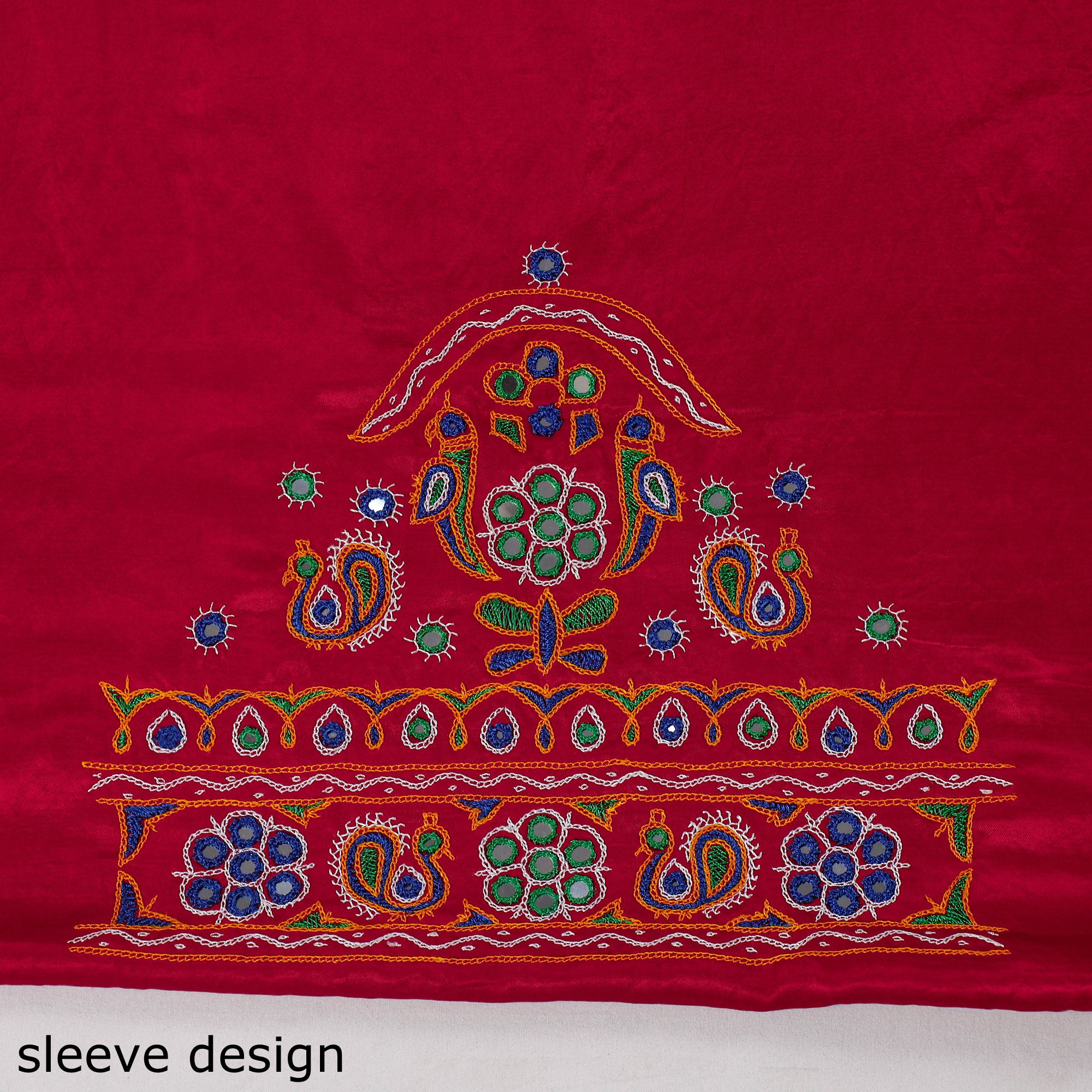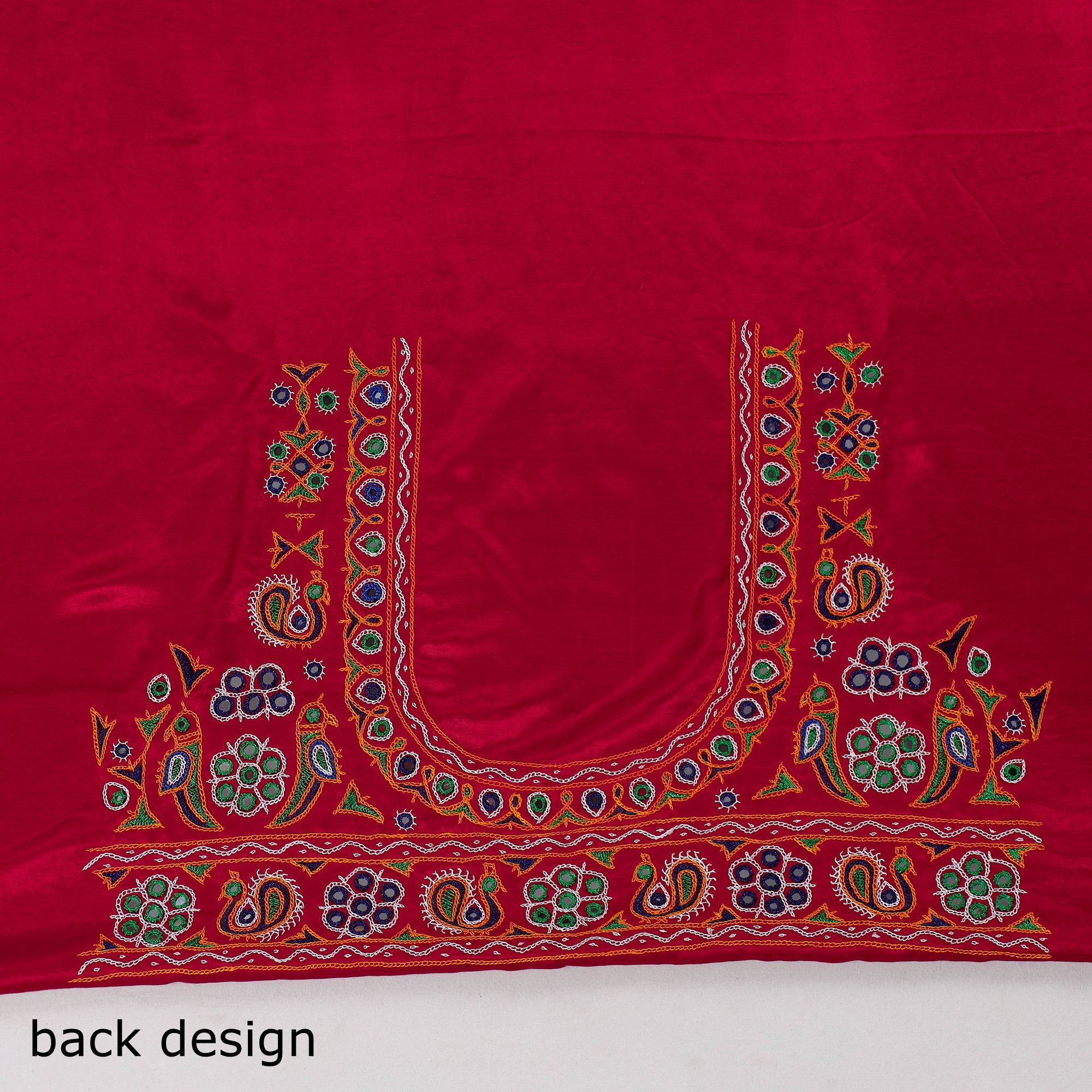 Fine quality ahir hand embroidery kutch mirror work mashru silk blouse piece. The kutch embroidery is a handicraft and textile signature art tradition of the tribal community of kutch district in Gujarat. This embroidery with its rich designs has made a notable contribution to the Indian embroidery traditions. The embroidery, practiced normally by women is generally done on fabrics of cotton & Silk, in the form of a net using cotton or silk thread.