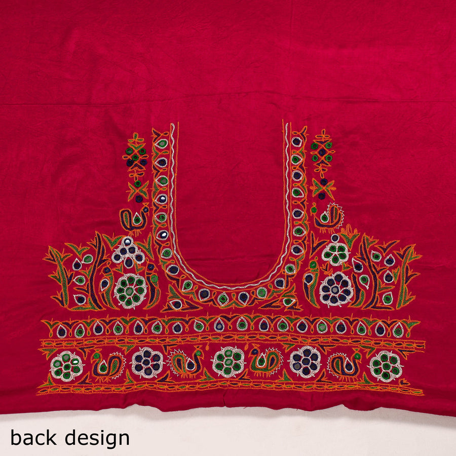 Fine quality ahir hand embroidery kutch mirror work mashru silk blouse piece. The kutch embroidery is a handicraft and textile signature art tradition of the tribal community of kutch district in Gujarat. This embroidery with its rich designs has made a notable contribution to the Indian embroidery traditions. The embroidery, practiced normally by women is generally done on fabrics of cotton & Silk, in the form of a net using cotton or silk thread.