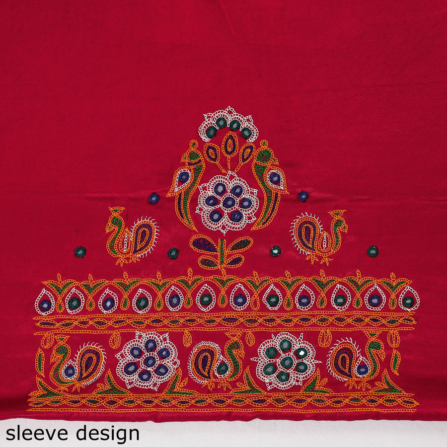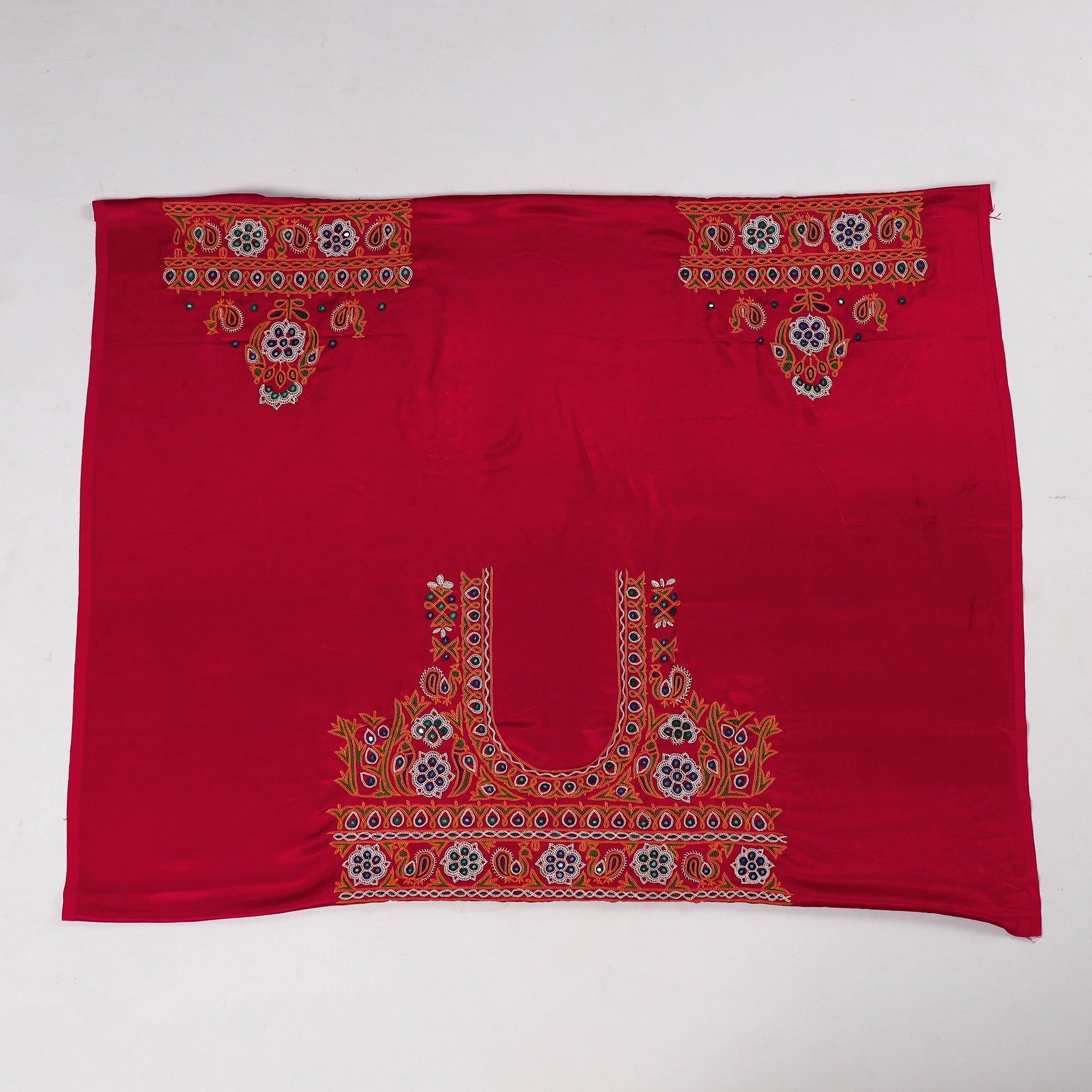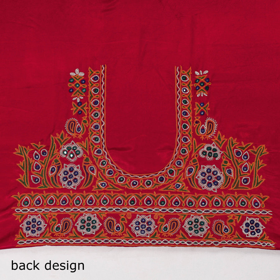 Fine quality ahir hand embroidery kutch mirror work mashru silk blouse piece. The kutch embroidery is a handicraft and textile signature art tradition of the tribal community of kutch district in Gujarat. This embroidery with its rich designs has made a notable contribution to the Indian embroidery traditions. The embroidery, practiced normally by women is generally done on fabrics of cotton & Silk, in the form of a net using cotton or silk thread.