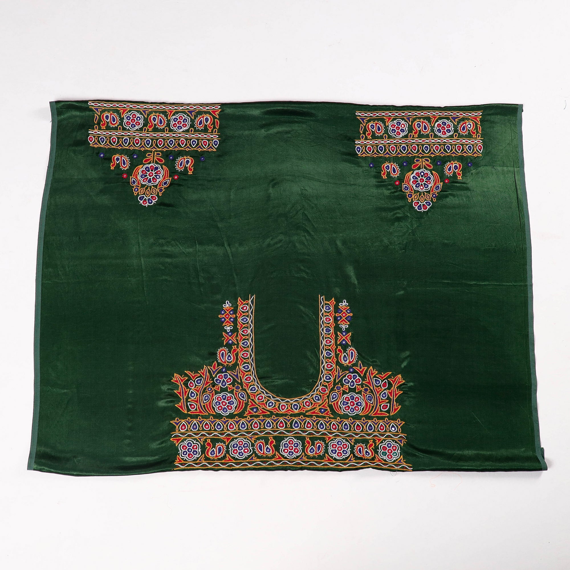 Fine quality ahir hand embroidery kutch mirror work mashru silk blouse piece. The kutch embroidery is a handicraft and textile signature art tradition of the tribal community of kutch district in Gujarat. This embroidery with its rich designs has made a notable contribution to the Indian embroidery traditions. The embroidery, practiced normally by women is generally done on fabrics of cotton & Silk, in the form of a net using cotton or silk thread.